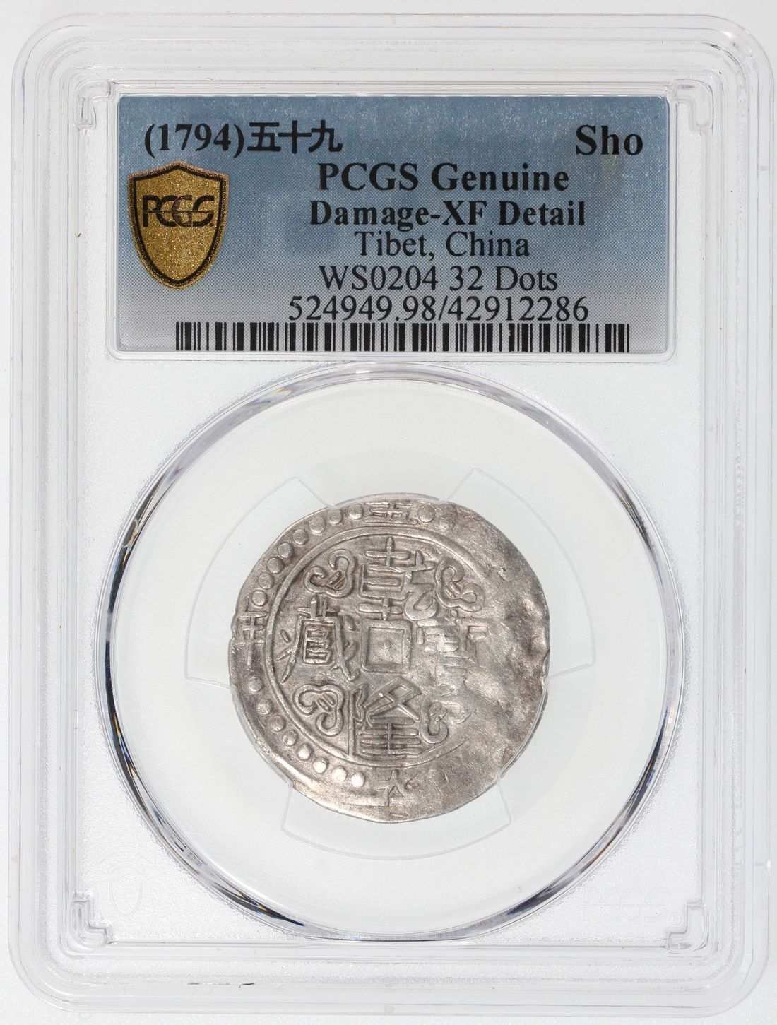 China, Qing Dynasty, Tibet, [PCGS XF Detail] silver sho, 59th Year of Qianlong (1794), 'Qian Long Bao Zang', 32 dots on obverse, (WS0204),