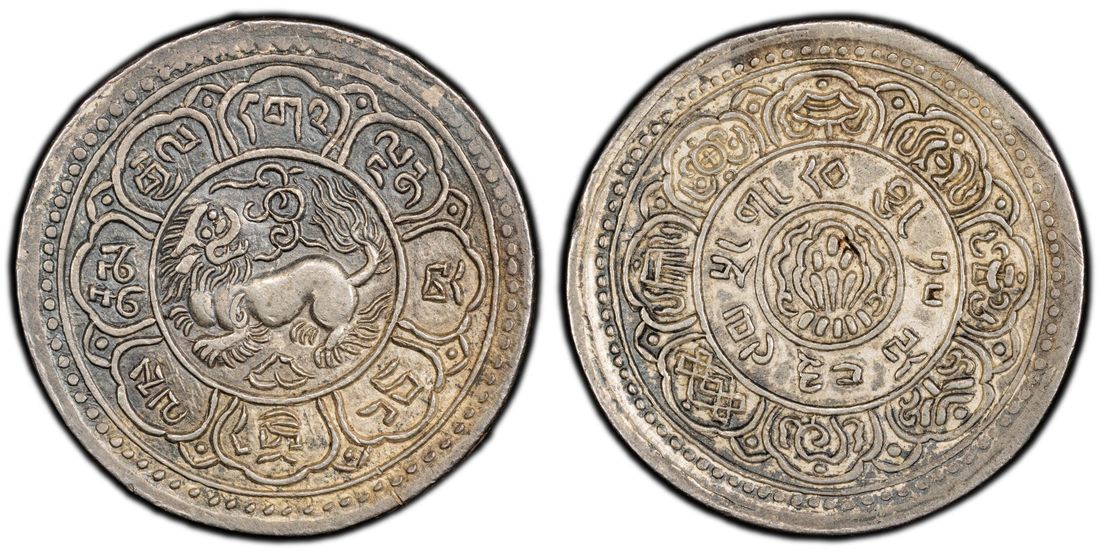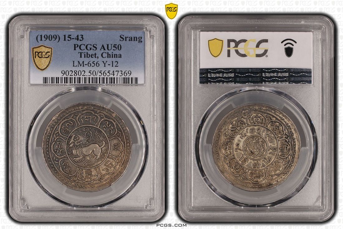 (x) China, Tibet, [PCGS AU50] silver tam srang, 15-43 (1909), snow lion looking back, ornaments above lion's back, within circle to which eight lotus petals are attached on obverse, triratna (triple gem) at centre surrounded by eight petalled lotus with the eight auspicious Buddhist symbols within on reverse, (YZM-390, LM-656, KM-Y-12), Cert. #56547369