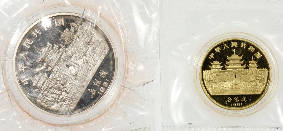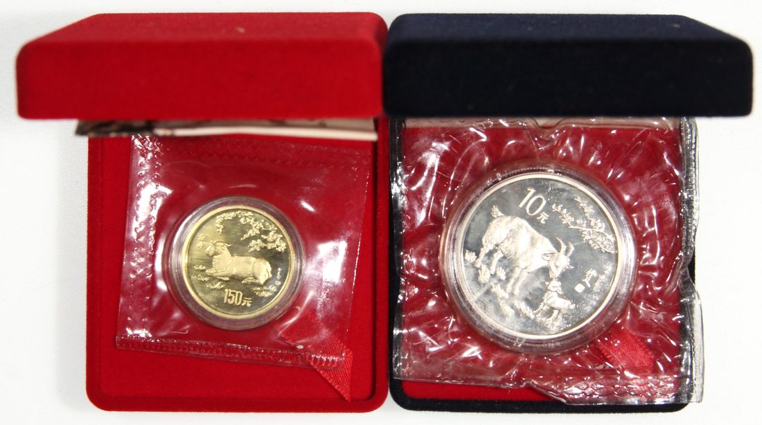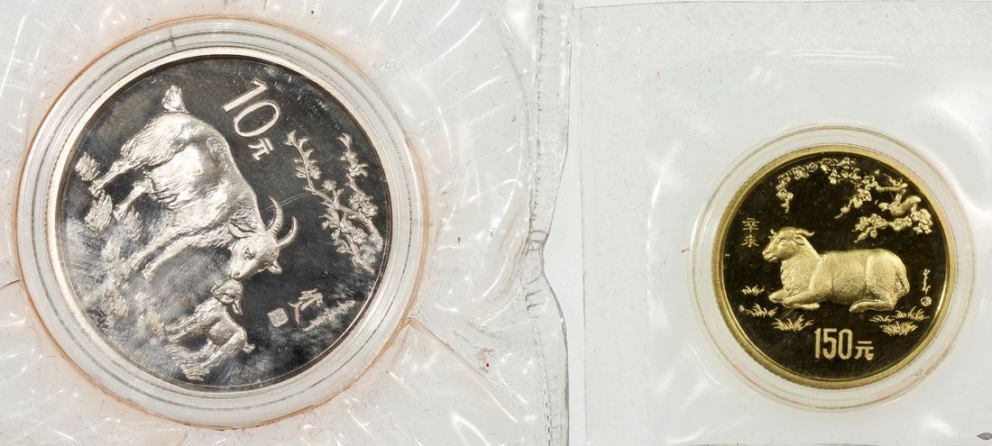 (x) People's Republic of China, a pair, 1991, "Year of Goat", includes gold proof 150 yuan and silver proof 10 yuan, gold weigh 8g, .916 fineness, silver weigh 15g, .900 fineness, mintage 7,500 and 15,000 respectively,
