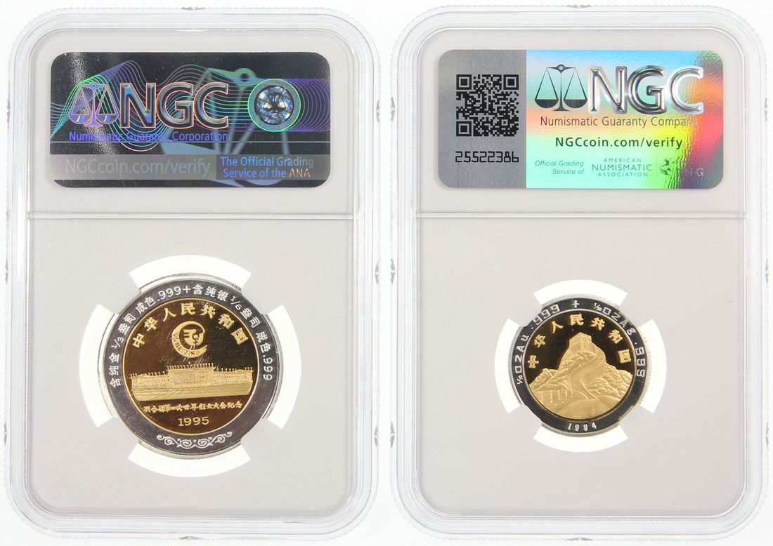 (x) People's Republic of China, a pair of bi-metal silver and gold 10 and 50 yuan, 1994 Dragon & Phoenix and 1995 U.N. Conference on Women, the 10 yuan with 1/10oz silver and 1/28oz gold, the 50 yuan with 1/3ox silver and 1/6oz gold, both NGC PF69 Ultra Cameo.(2) Cert. 6729752-003 and 6728522-016