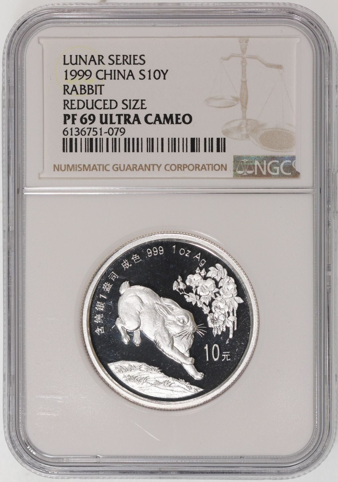 (x) People's Republic of China, [NGC PF69 Ultra Cameo] silver proof piedfort 10 yuan, 1999, Year of the Rabbit commemorative issue, ASW 1oz, Cert. #6136751-079, mintage of 8000