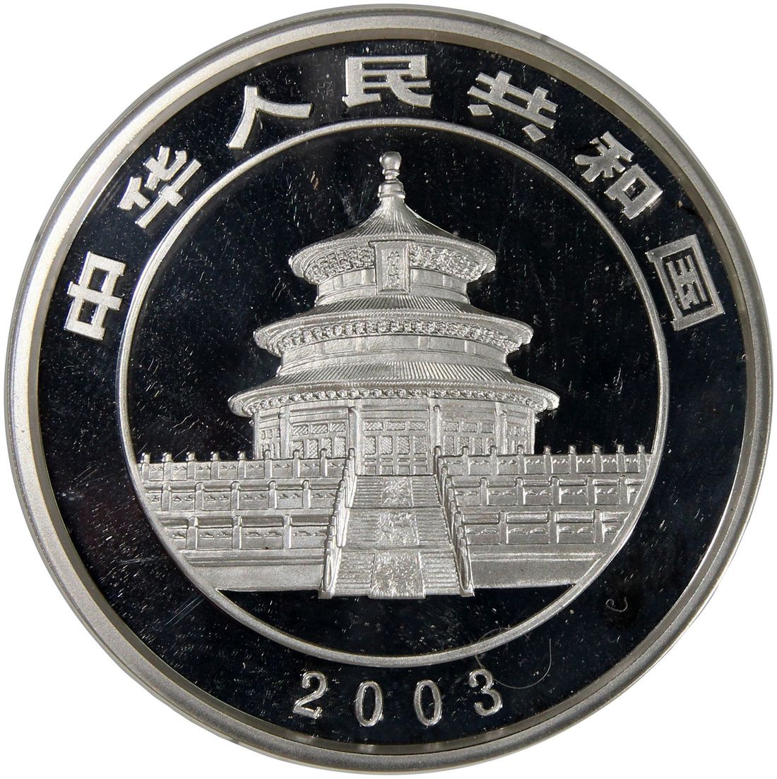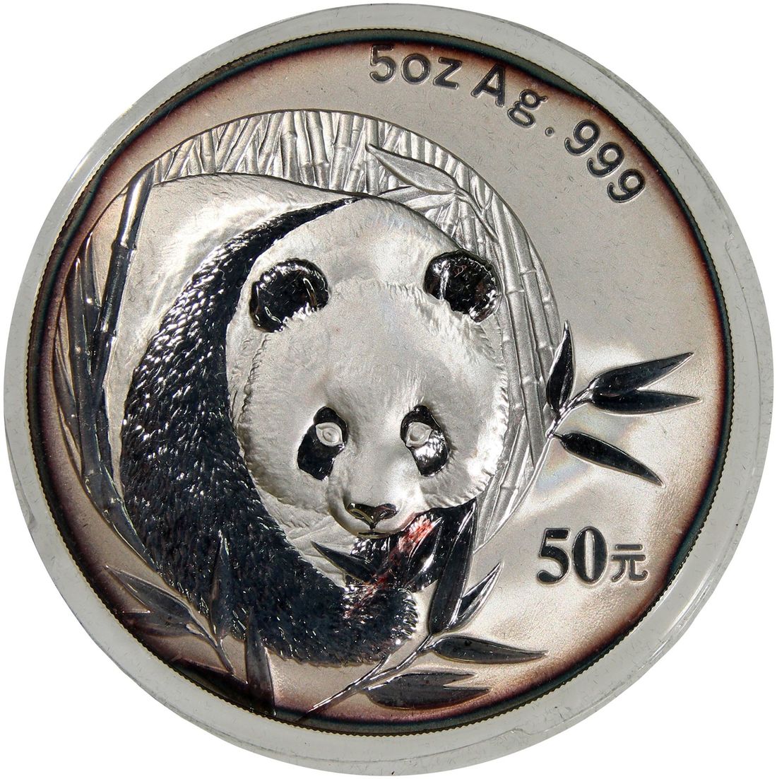 (x) People's Republic of China, silver proof 50 yuan, 2003, "Panda", 5oz, rim toned on obverse,with original plastic case, uncirculated.
