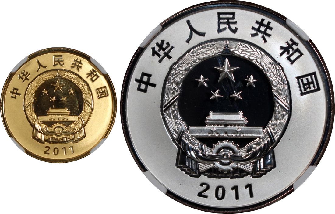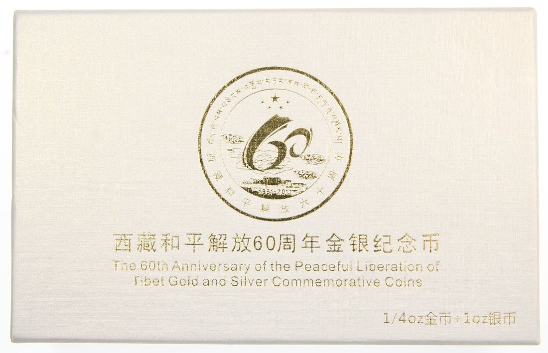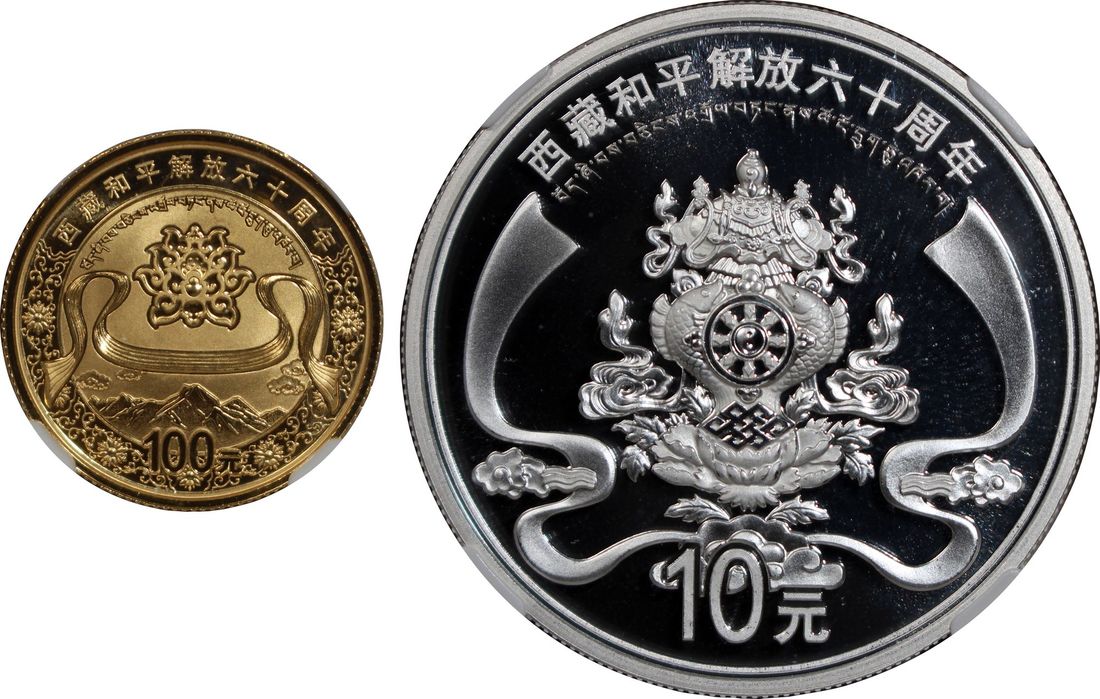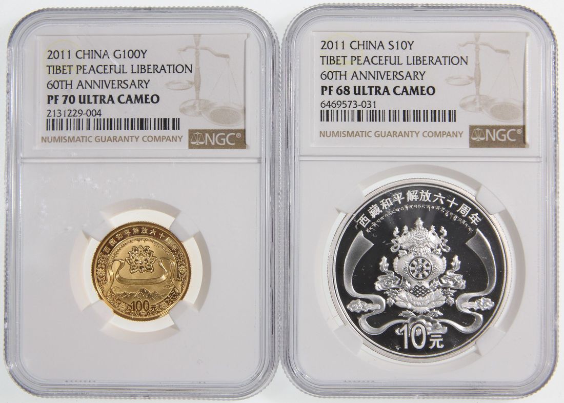 People's Republic of China, a pair of gold proof 100 yuan and silver proof 10 yuan, 2011, "60th Anniversary of the Peaceful Liberation of Tibet" commemorative, 0.25oz and 1oz respectively,