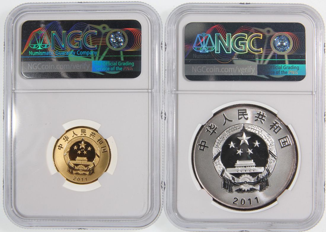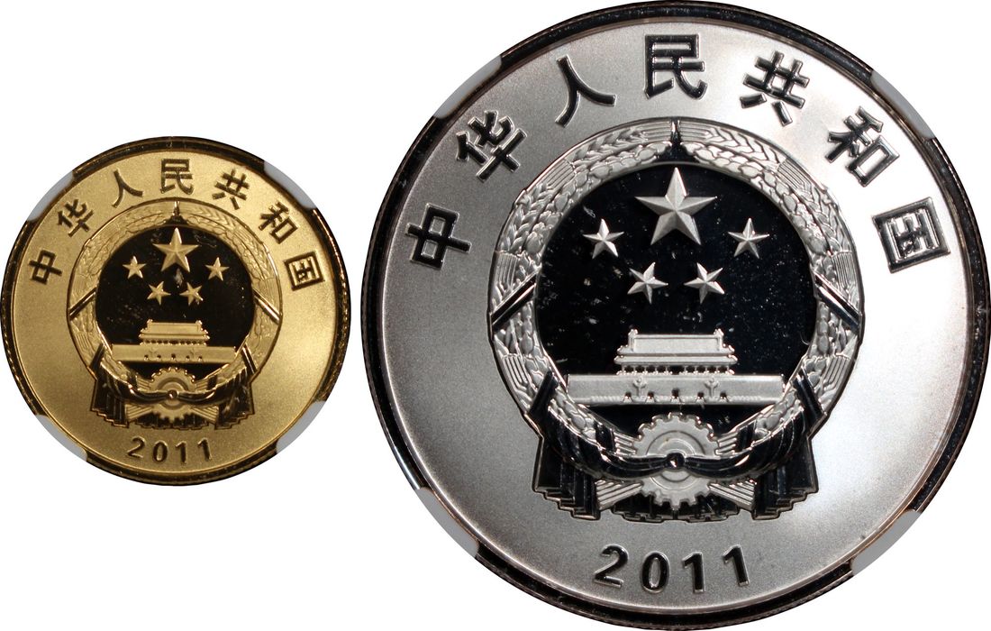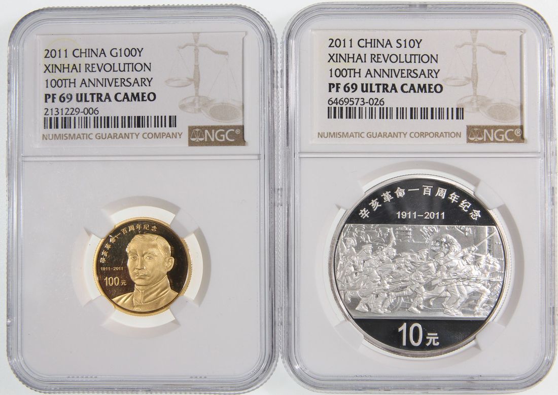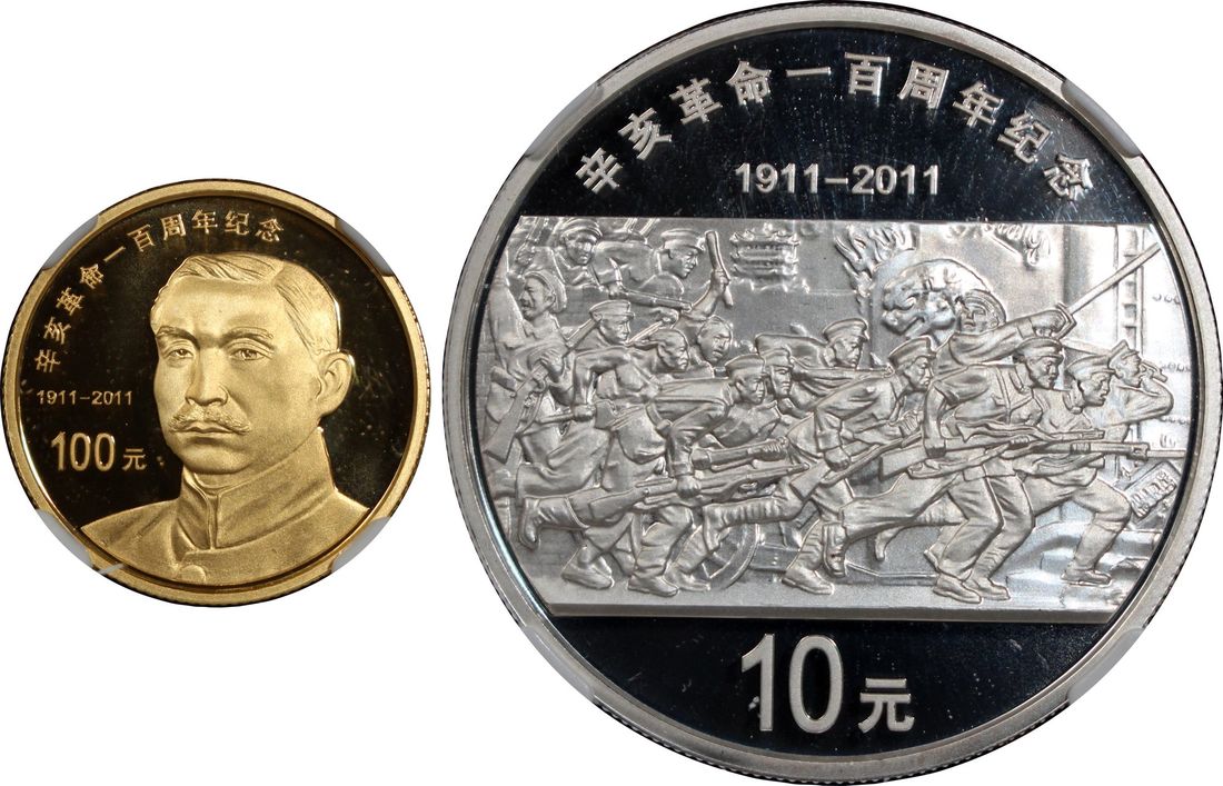 People's Republic of China, a pair of gold proof 100 yuan and silver proof 10 yuan, 2011, "100th Anniversary of Xinhai Revolution", 0.25oz and 1oz respectively,