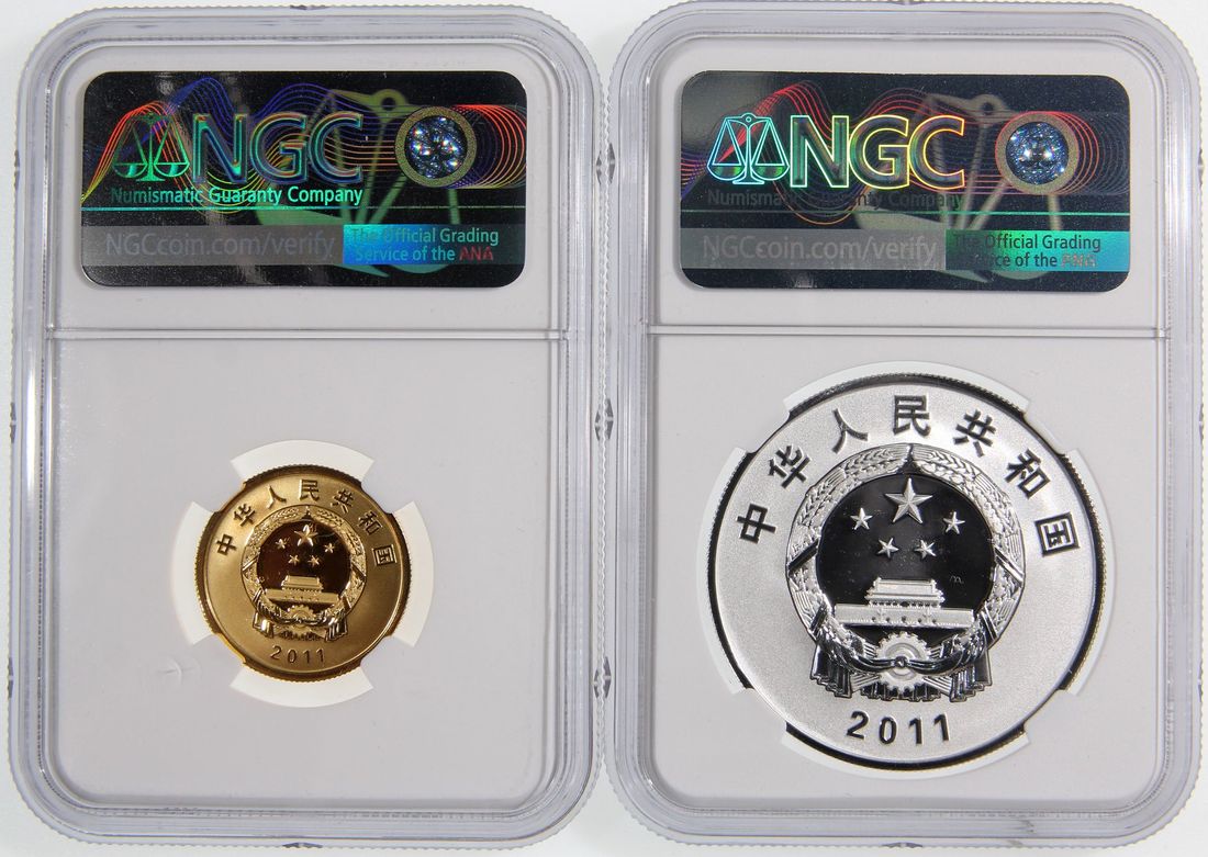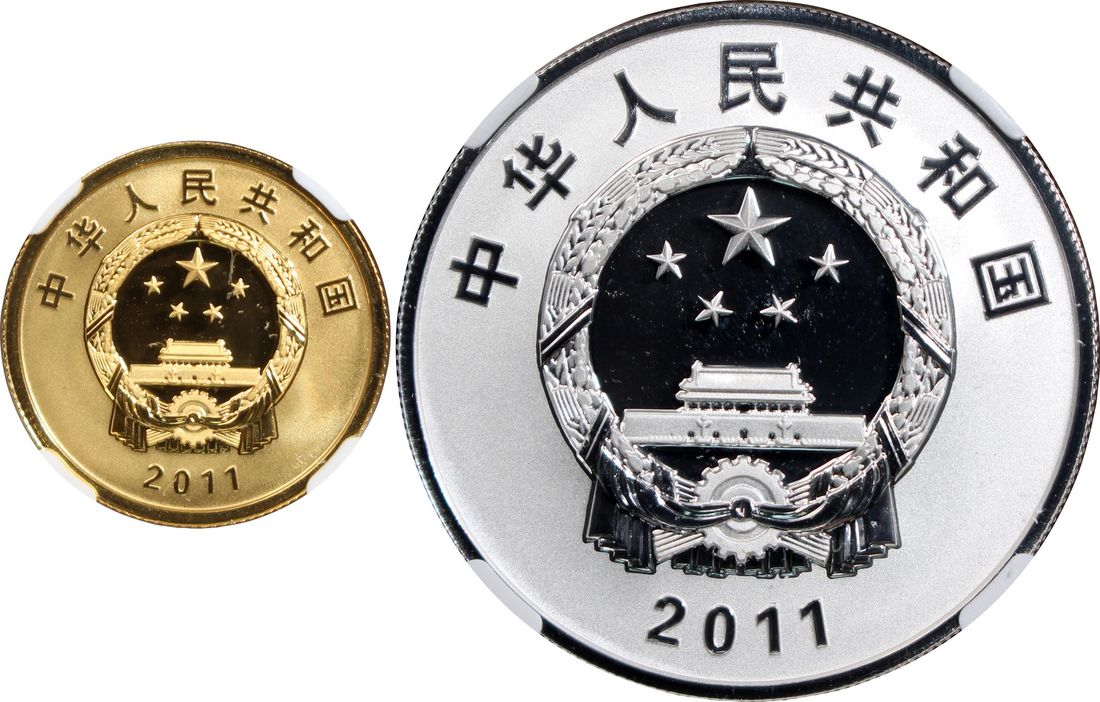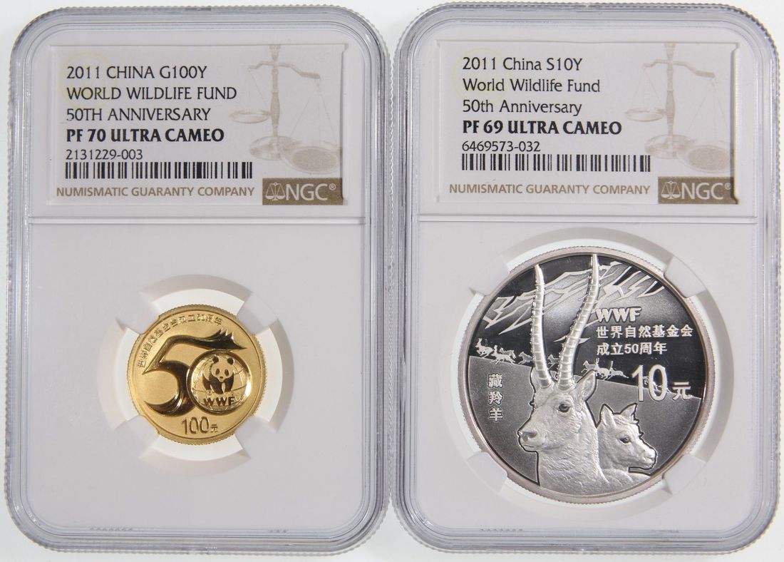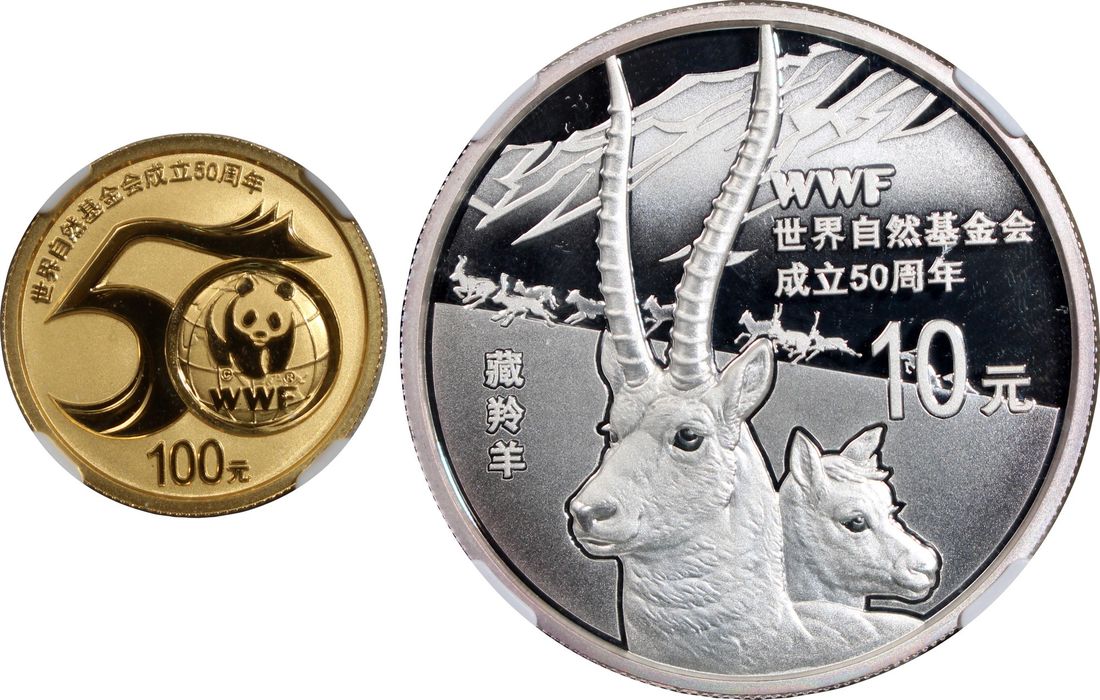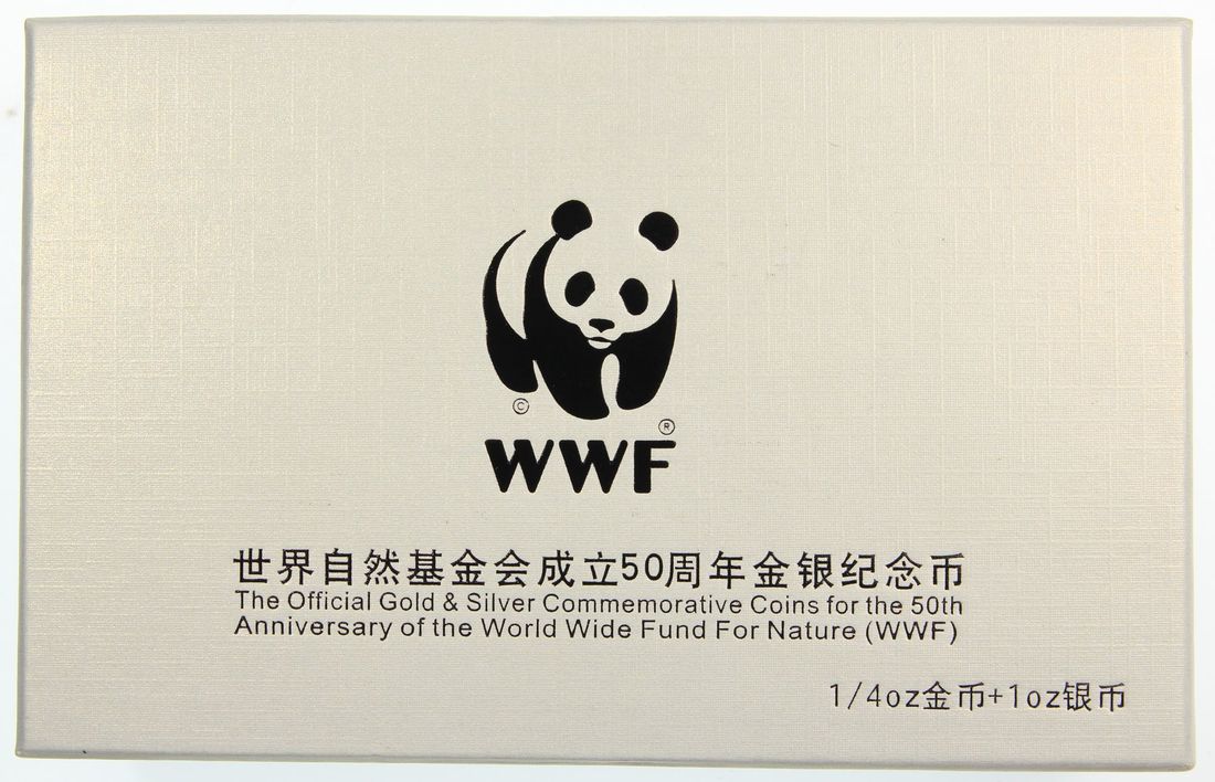 People's Republic of China, a pair of gold proof 100 yuan and silver proof 10 yuan, 2011, "50th Annivesary of WWF", 0.25oz and 1oz respectively,