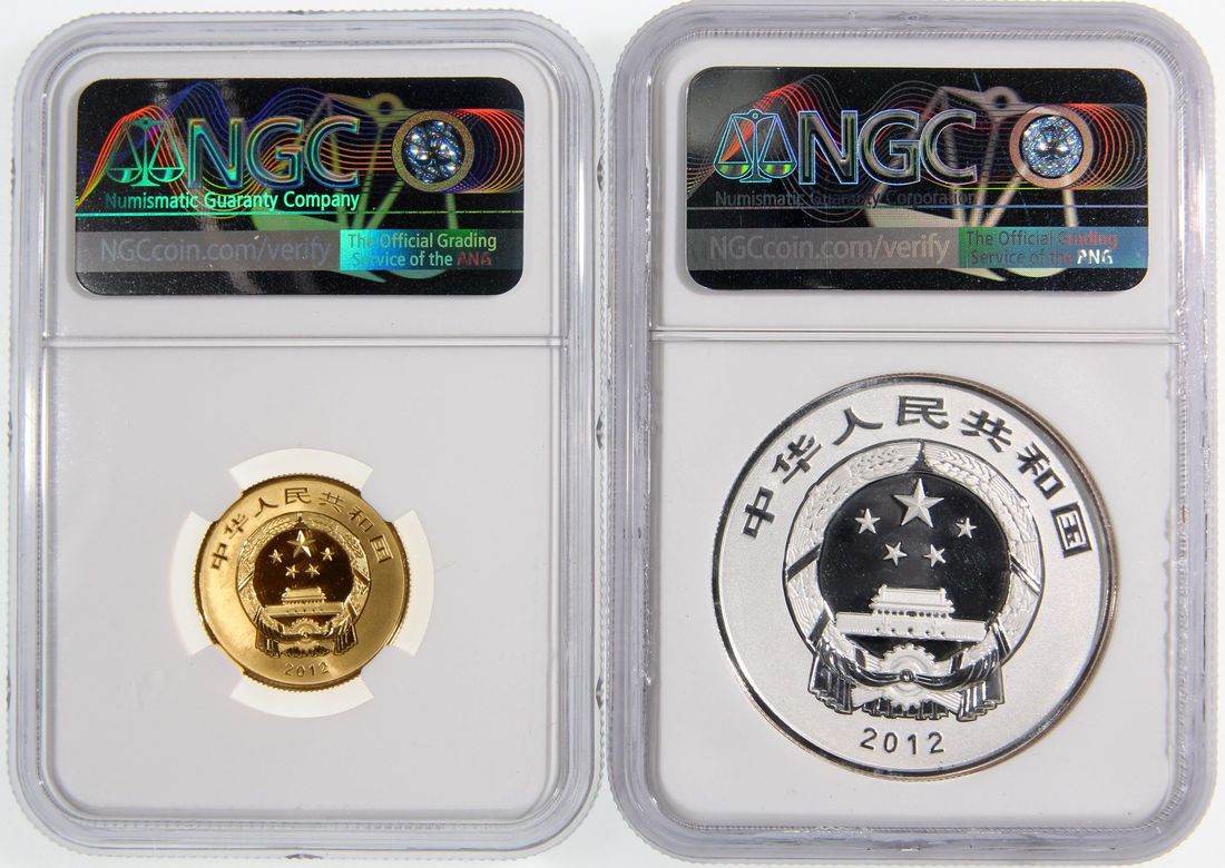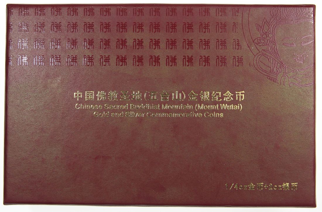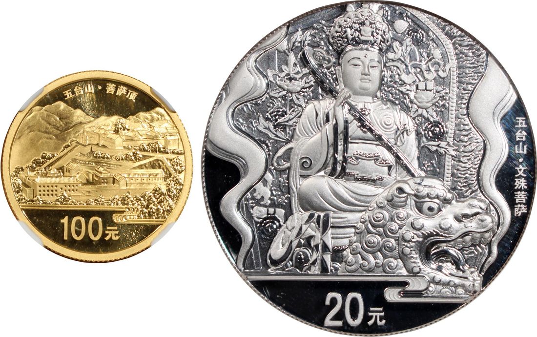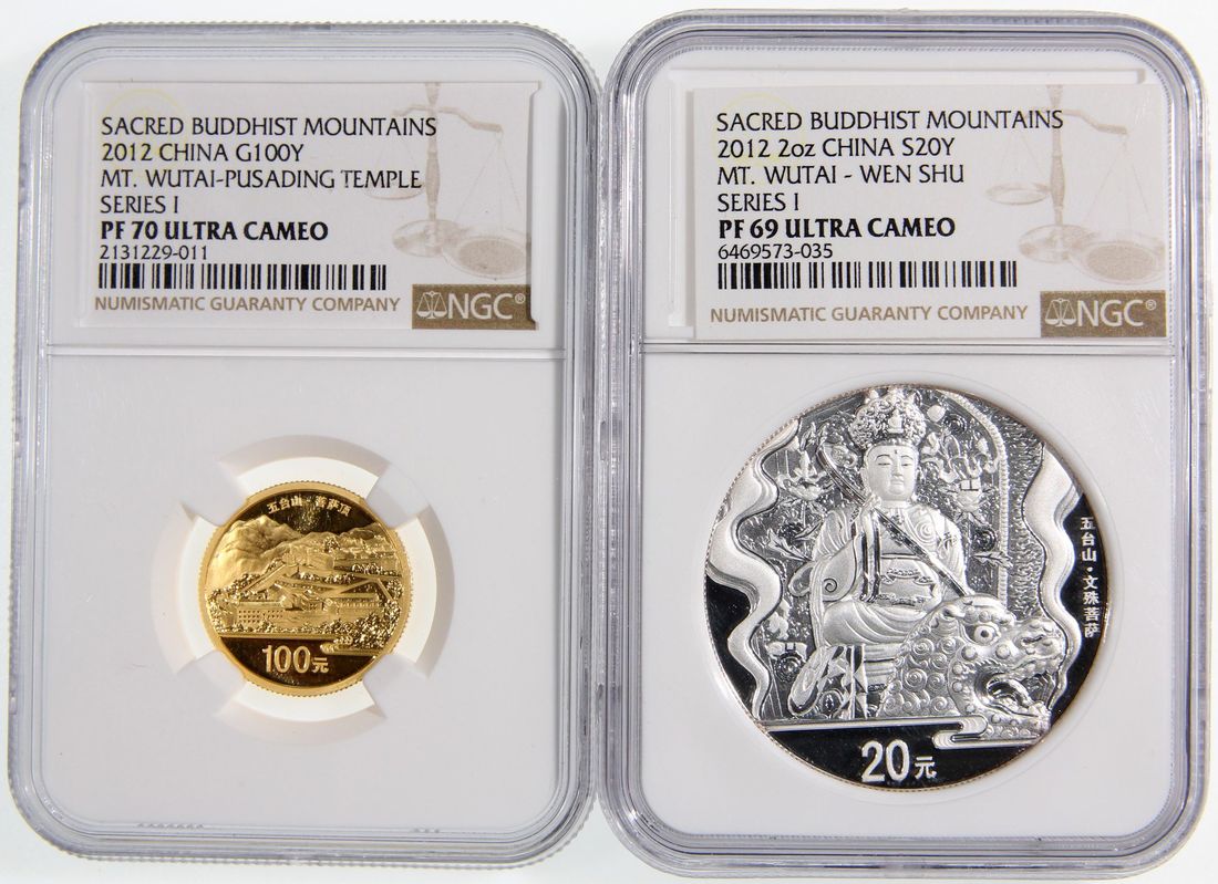 People's Republic of China, a pair of gold proof 100 yuan and silver piedford proof 20 yuan, 2012, "Sacred Buddist Mounts - Series 1, Mt. Wutai", 'Pusading Temple' and 'Wen Shu Buddha', 0.25oz and 2oz respectively,