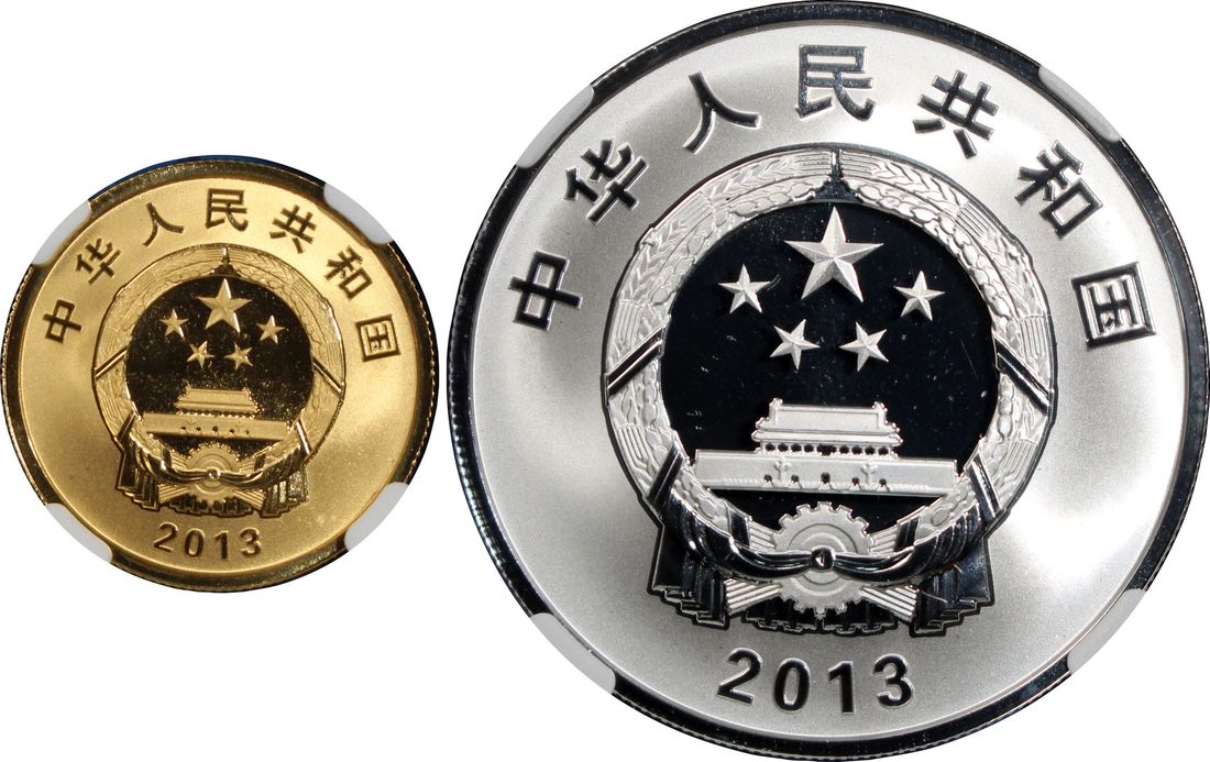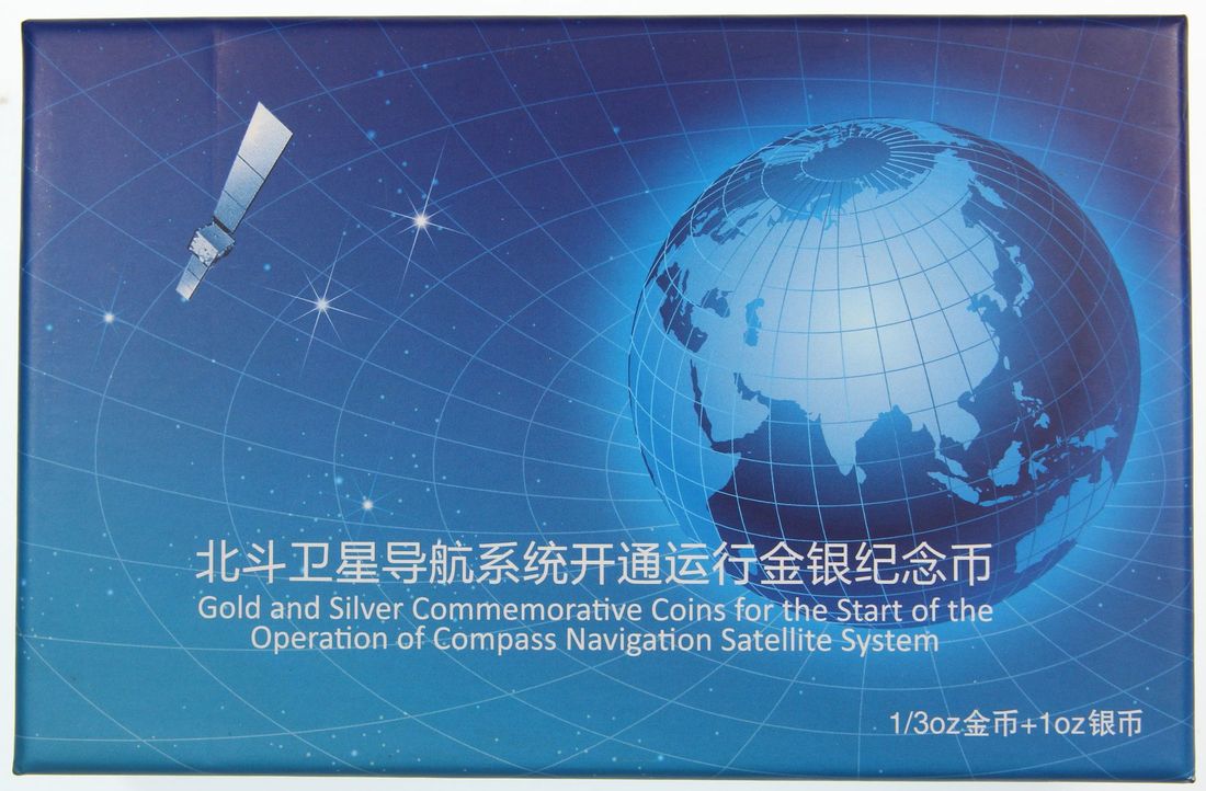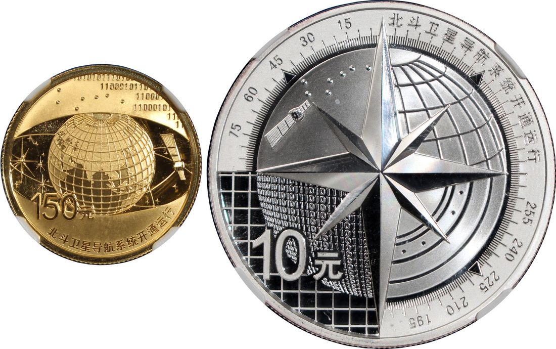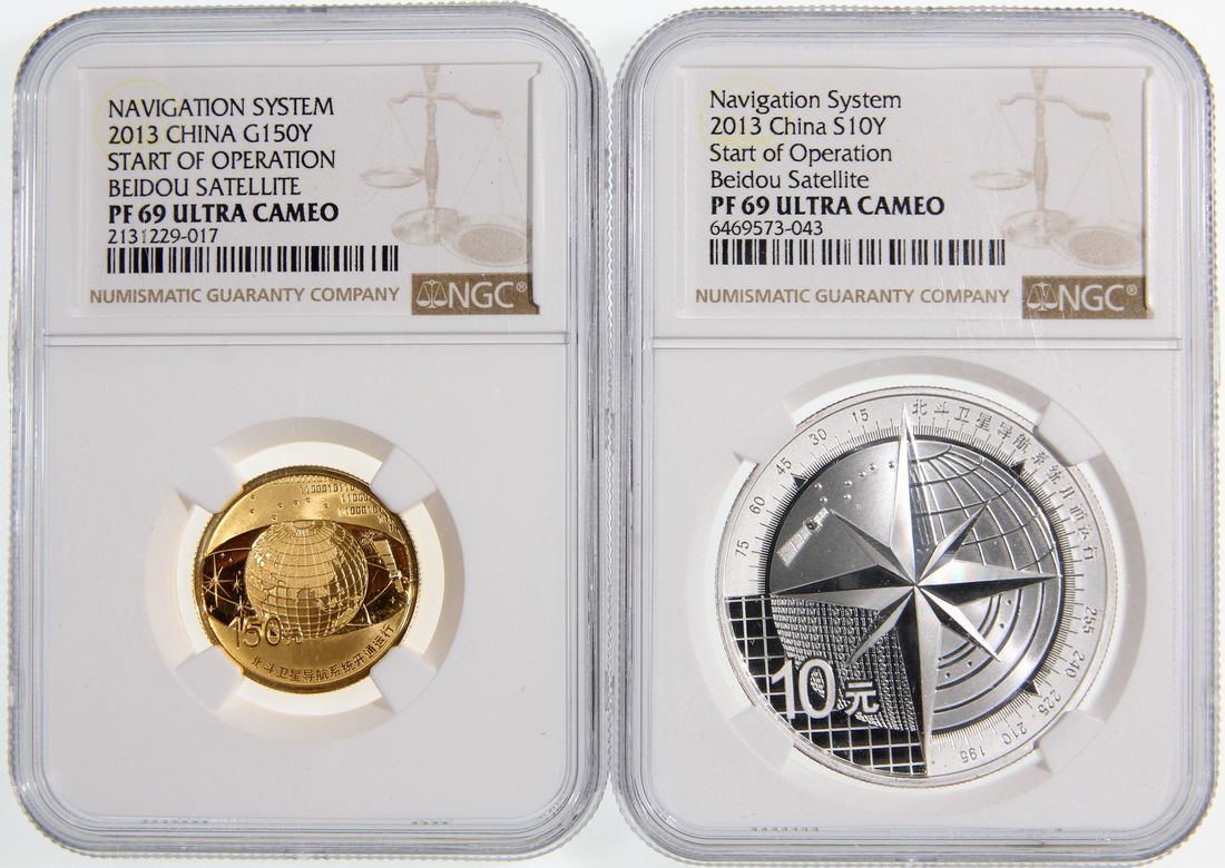 People's Republic of China, [NGC PF69 UC] a pair of gold proof 100 yuan and silver proof 10 yuan, 2013, "Start of Operation of Compass Navigation Satellite System", 0.25oz and 1oz respectively,