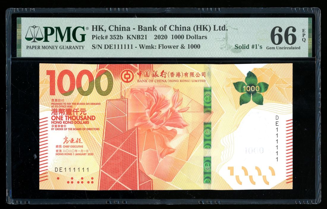 Bank of China, Hong Konng, $1000, 2020, solid serial number DE111111, (Pick 352b), PMG 66EPQ. $1000 solid serial numbers always popular