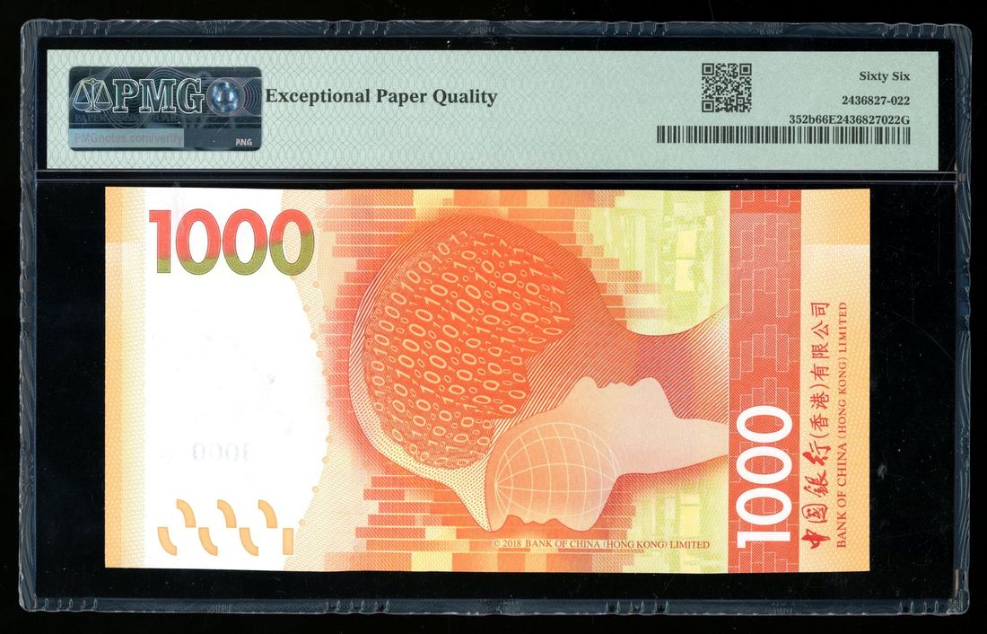 2020年中國銀行香港壹仟元,幸運號DE111111,PMG 66EPQ,幸運號壹仟元一直有價有市