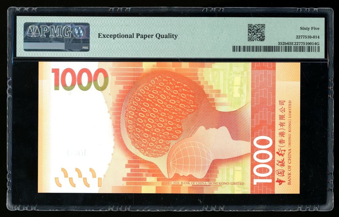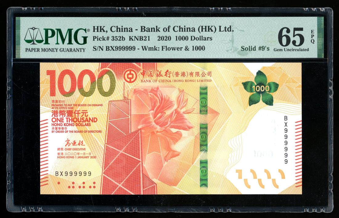 2020年中國銀行香港壹仟元,幸運號BX999999,PMG 65EPQ