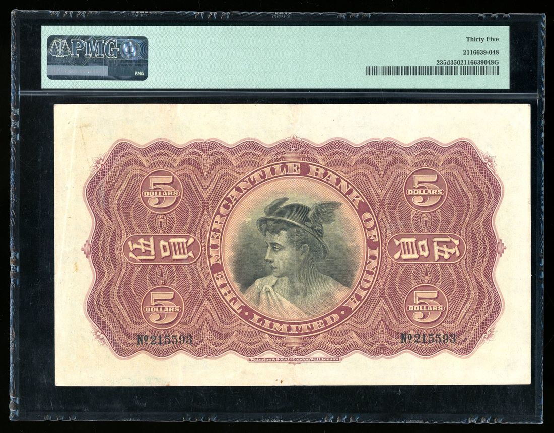 Mercantile Bank of India, Hong Kong, $5, 29.11.1941, serial number 215593, (Pick 235d), PMG 35. A well above average piece with original paper and strikingly vibrant printing! Rare without any remarks!