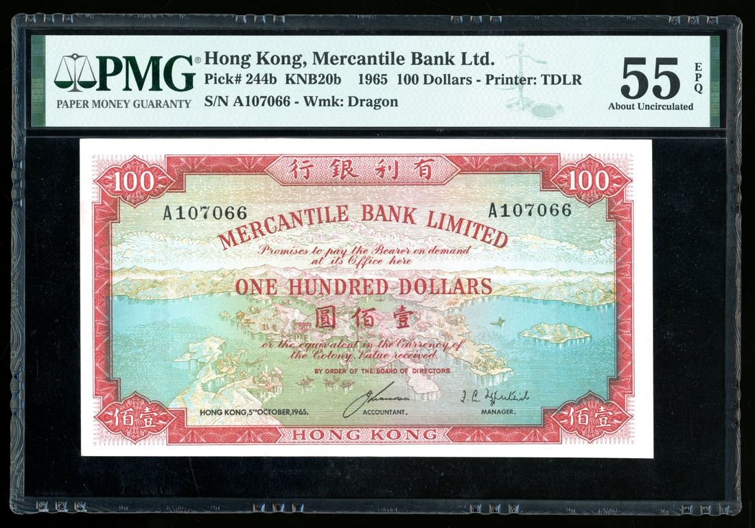 Mercantile Bank Limited, Hong Kong, $100, 5.10.1965, serial number A107066, (Pick 244b), PMG 55EPQ. An uncommon early date $100 in original condition. PMG census 2nd highest grade with EPQ and only 6 better at 58EPQ