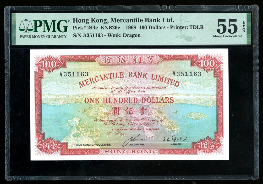 Mercantile Bank Limited, Hong Kong, $100, 27.7.1968, serial number A351163, (Pick 244c) PMG 55EPQ. Key type of the series in high grade condition. Always popular