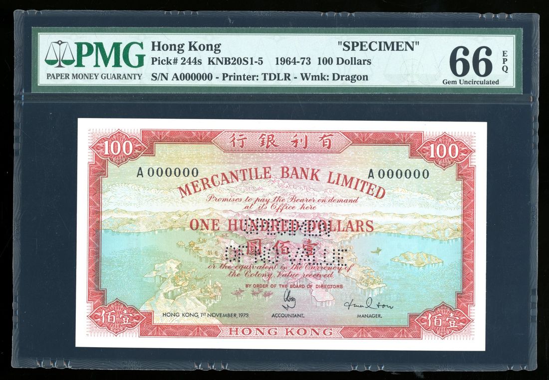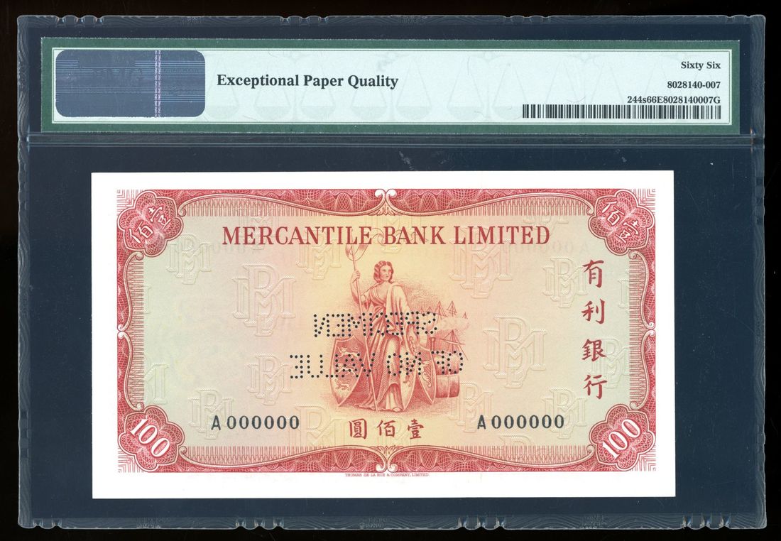 Mercantile Bank Limited, Hong Kong, specimen $100, 1.11.1973, serial number A000000, (Pick 244s), PMG 66EPQ. High grade example without usual mounting