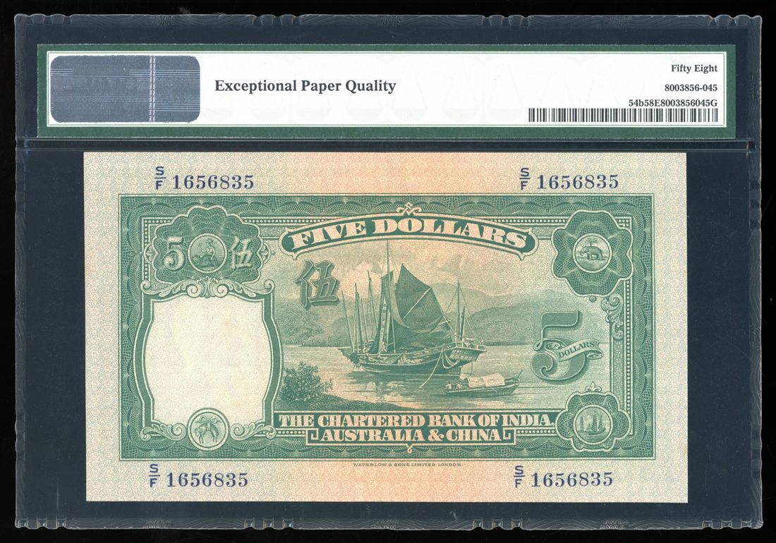 Chartered Bank of India, Australia & China, Hong Kong, $5, 26.2.1948, serial number S/F 1656835, (Pick 54b), PMG 58EPQ