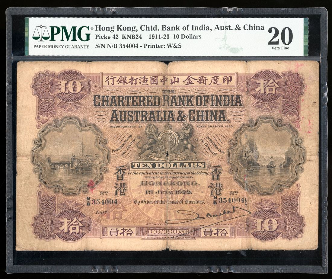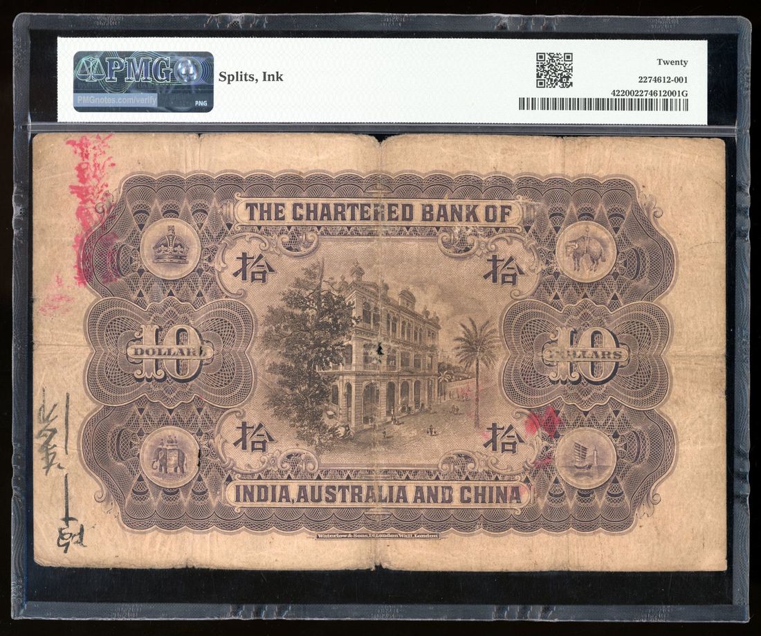 1922年印度新金山中國渣打銀行拾員,編號N/B 354004,左下手簽署名,PMG 20,有裂及墨水印。雖然流通痕跡明顯,但依然十分罕見,是早期拾員「牛皮」價格較親民的一枚