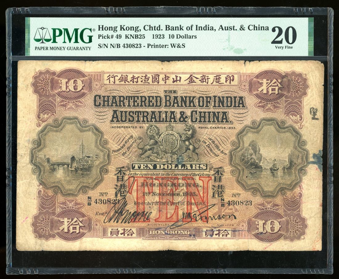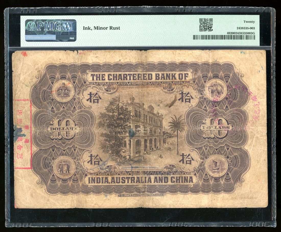 1923年印度新金山中國渣打銀行拾員,編號N/B 430823,左下手簽署名,中心位置有「TEN」字樣,PMG 20,有墨水印及輕微鏽跡。罕見的單年發行版式,稀有原裝狀態。 PMG統計顯示,僅有5枚品相更佳,且通常有修復痕跡。香港紙幣收藏之嚴重稀缺品種,切莫失之交臂!