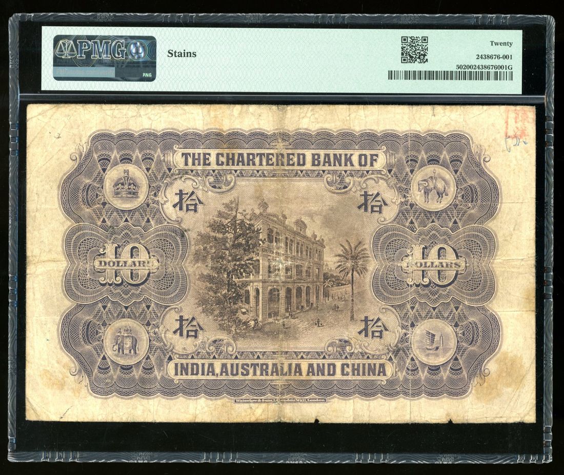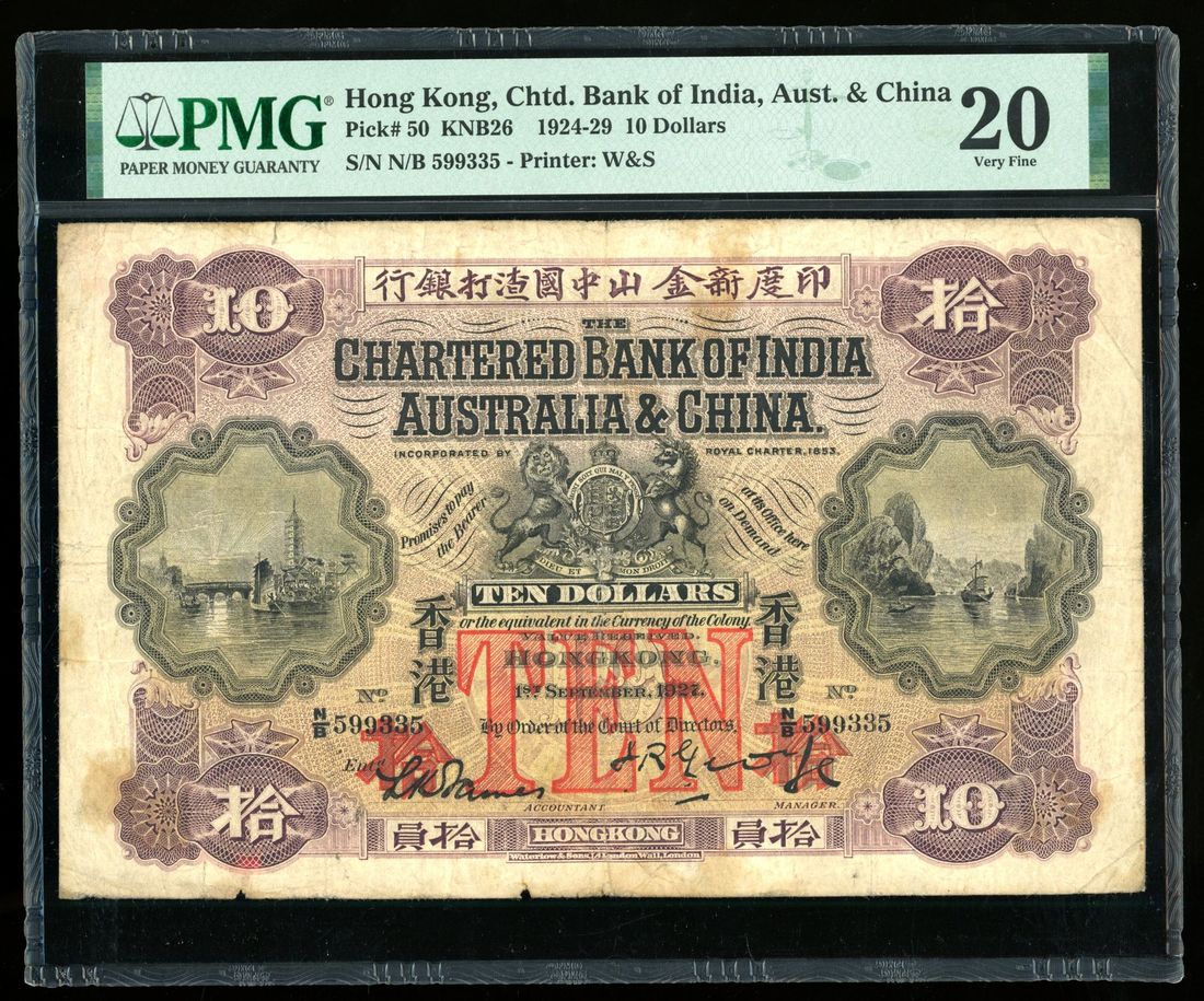 1927年印度新金山中國渣打銀行拾員,編號N/B 599335,左下手簽署名,PMG 20,有漬。雖然PMG並未把三個發行年份區分為三個參考編號,但翻閱拍賣記錄,1929年版顯然最為常見,其次是1924年版。編者認為,市場上現存的原裝1927年版不足10枚。對於任何希望補全所有年份的藏家來說,絕對不容錯過!
