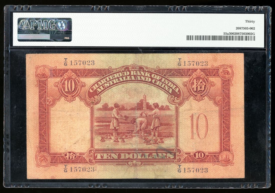 1931年印度新金山中國渣打銀行拾員,編號T/G 157023,左下手簽署名,PMG 30。此版式中之首發日期,PMG評級報告中僅3枚評分高於此枚,最高評級為40