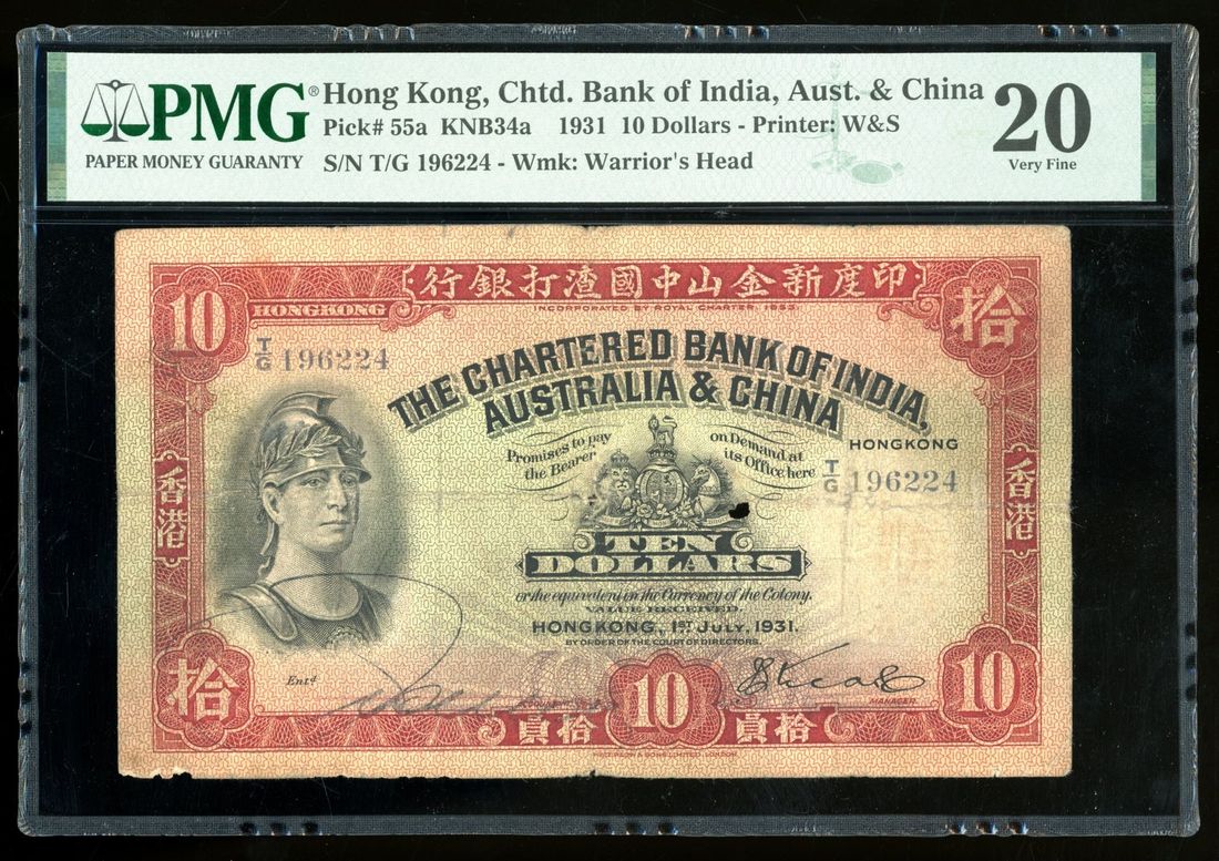 Chartered Bank of India, Australia, China, Hong Kong, $10, 1.7.1931, serial number T/G 196224, one handsigned signature,