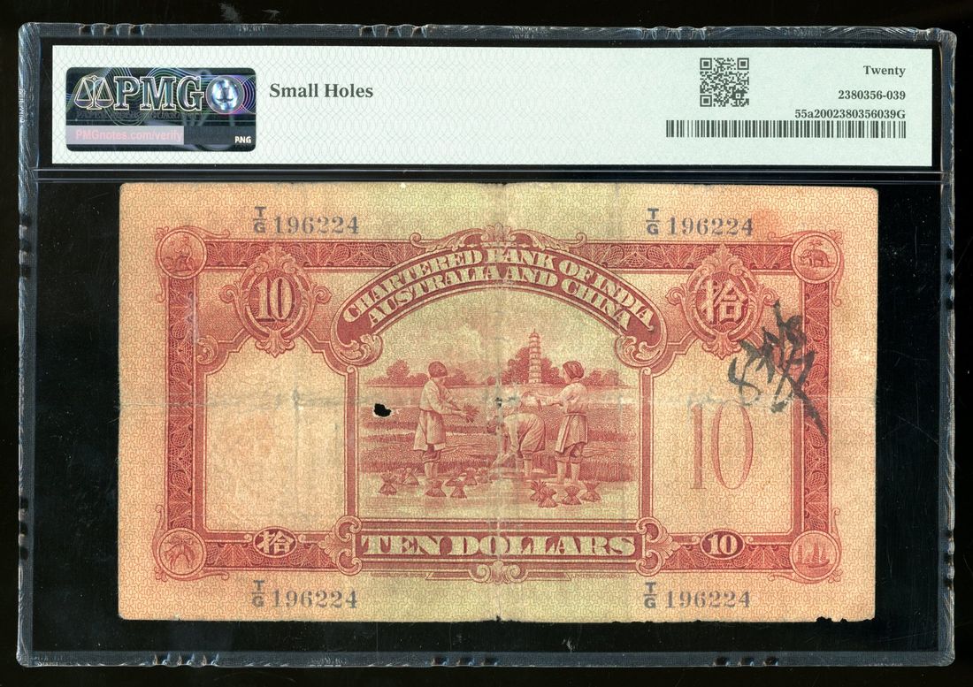1931年印度新金山中國渣打銀行拾員,編號T/G 196224,左下手簽署名,PMG 20,有小孔。此版式中之首發日期