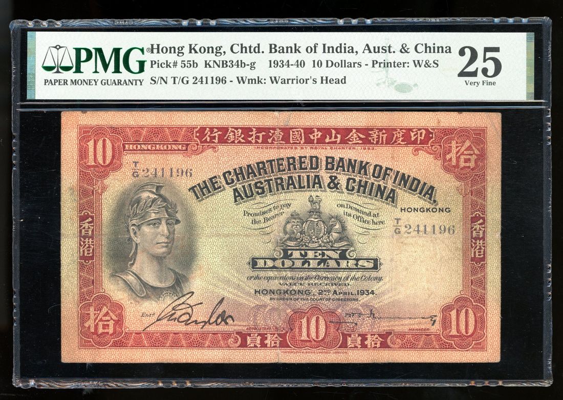 Chartered Bank of India, Australia & China, Hong Kong, $10, 2.4.1934, serial number T/G 241196, one handsigned signature,