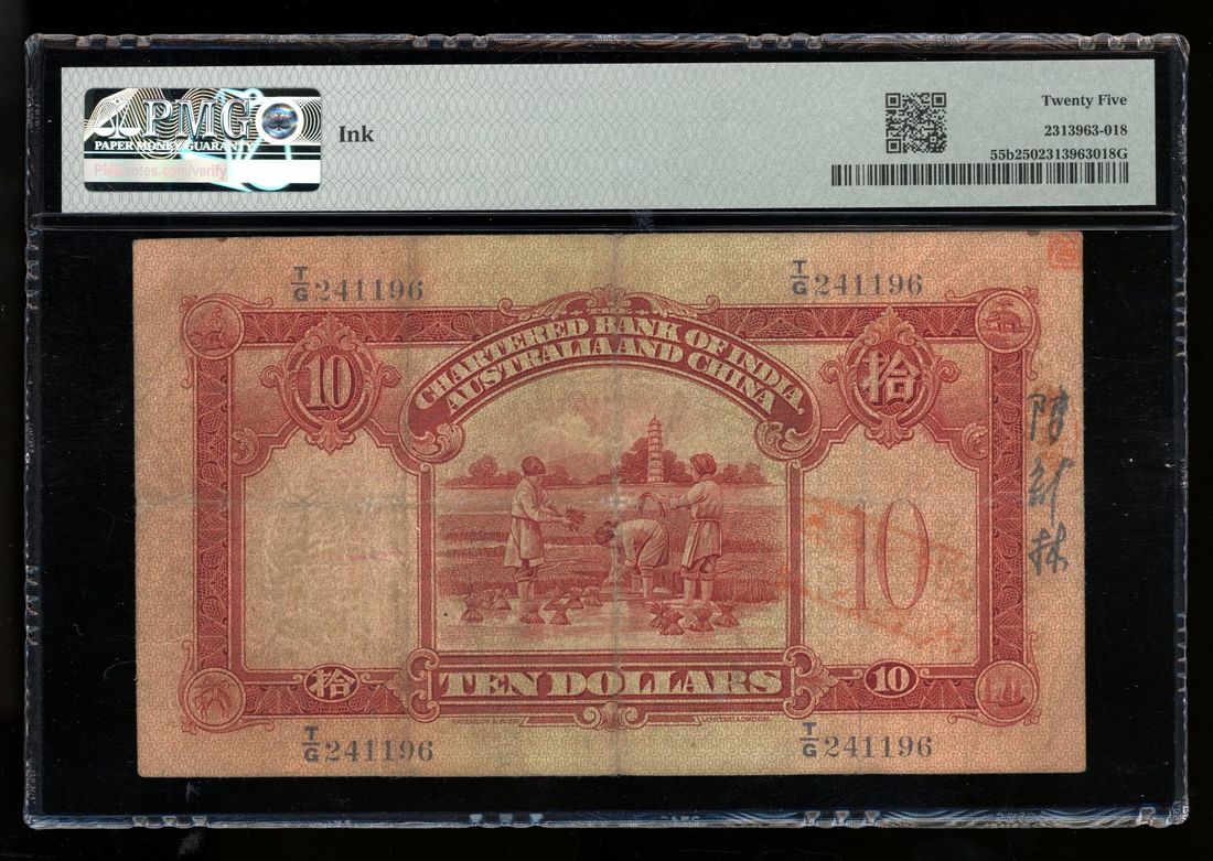 1934年印度新金山中國渣打銀行拾員,編號T/G 241196,左下手簽署名,PMG 25,墨水印
