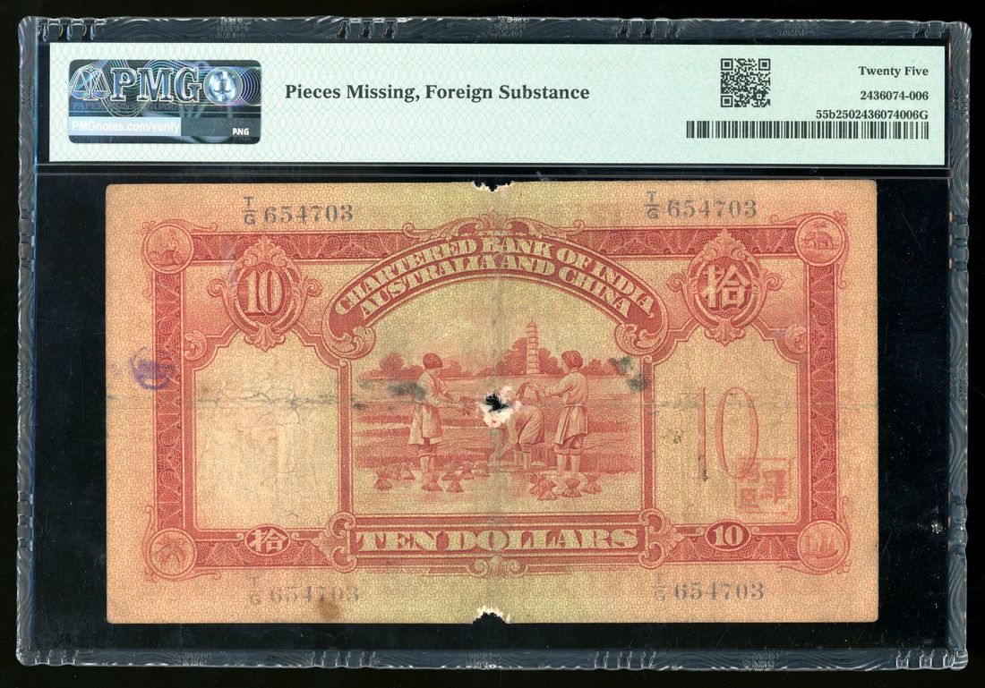 1940年印度新金山中國渣打銀行拾員,編號T/G 654703,左下手簽署名,PMG 25,有外附物及紙邊有缺