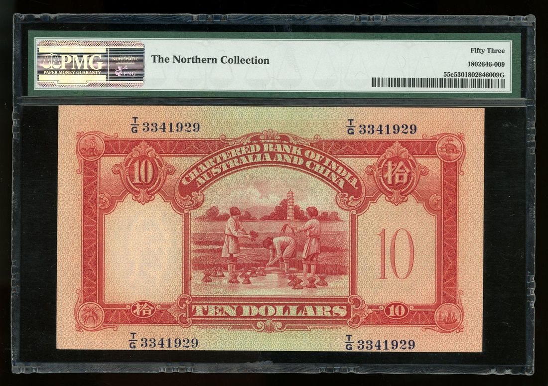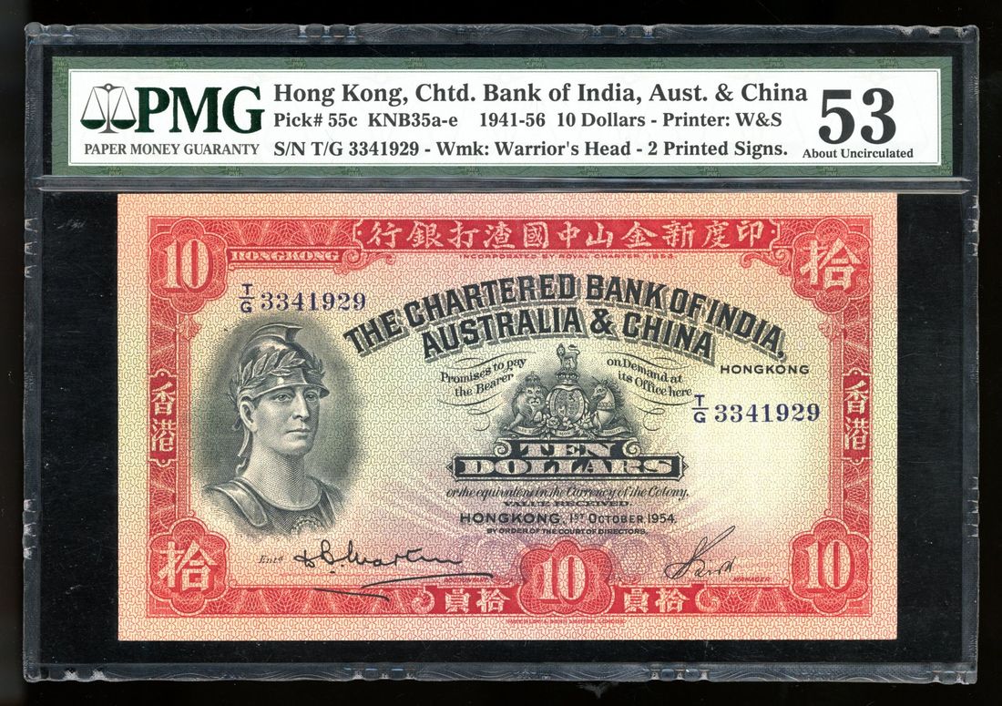 Chartered Bank of India, Australia & China, Hong Kong, $10, 1.10.1954, serial number T/G 3341929, (Pick 55c), PMG 53 (The Northern Collection)