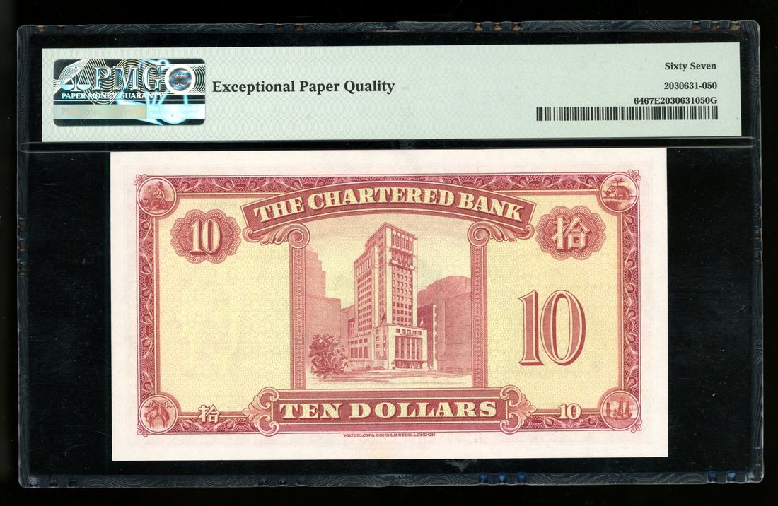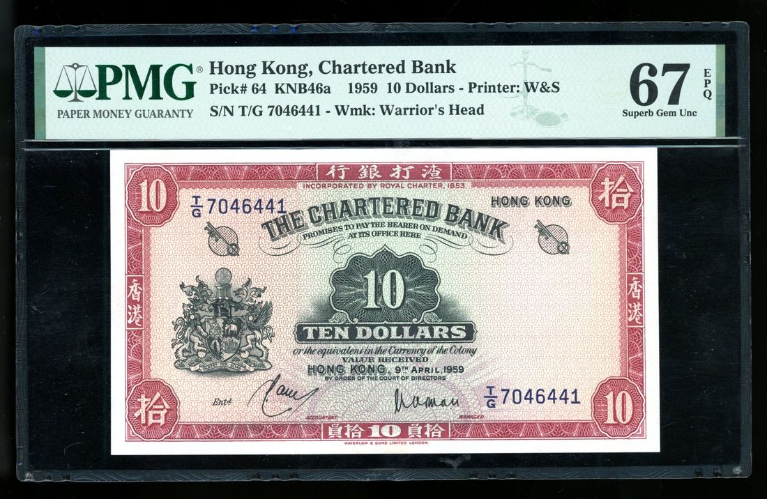 1959年渣打銀行拾員,編號T/G 7046441,PMG 67EPQ。該系列的關鍵首發日期, PMG評級紀錄中之冠軍分
