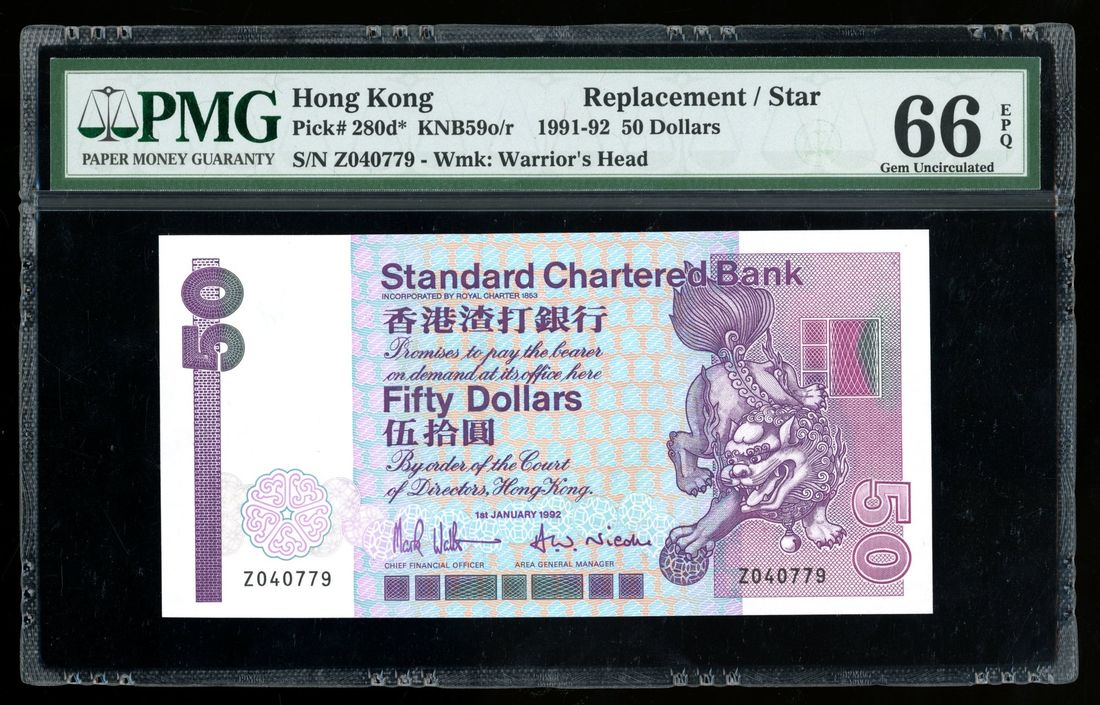 Standard Chartered Bank, Hong Kong, replacement $50, 1.1.1992, serial number Z040779, (Pick 280d*), PMG 66EPQ. Last date replacement issue for this type. Key type. Rare