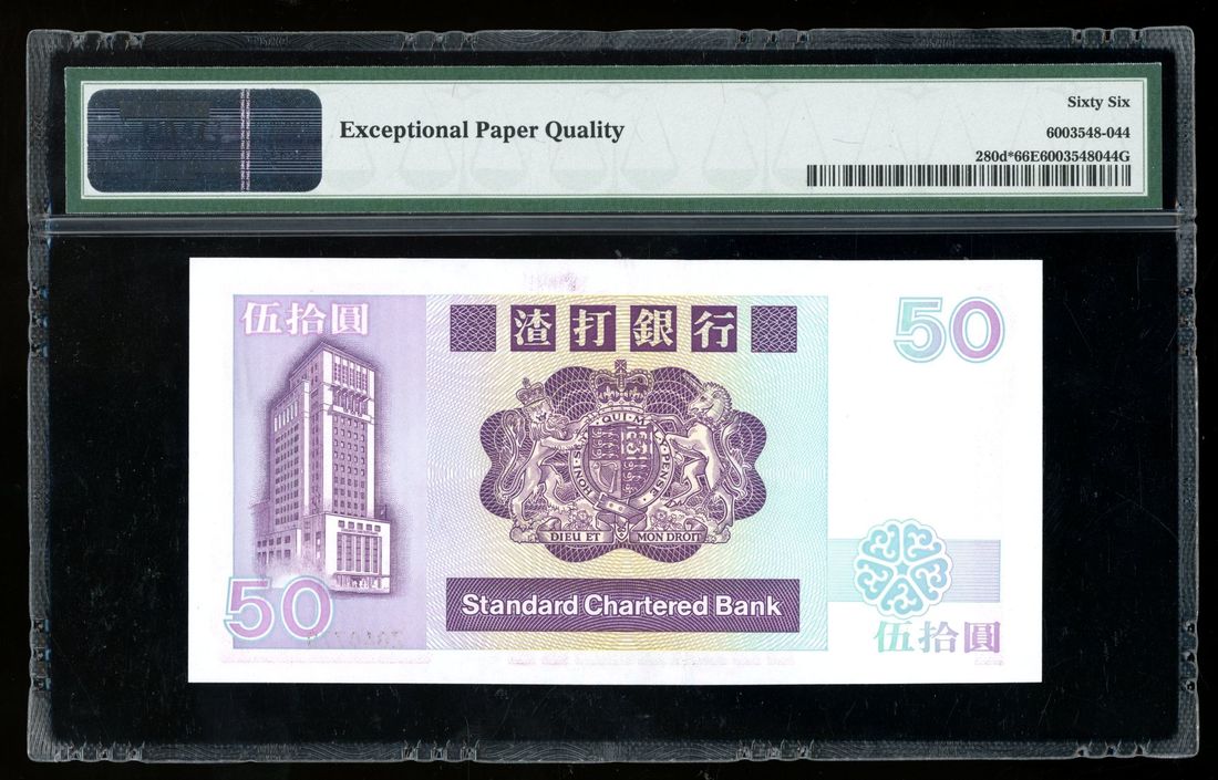 1992年渣打銀行伍拾圓,補號Z040779,PMG 66EPQ,稀有尾發日期補版