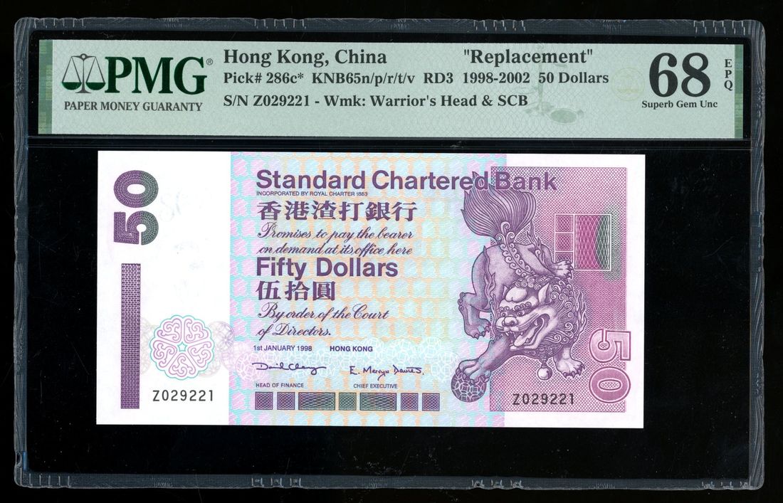 Standard Chartered Bank, Hong Kong, replacement $50, 1.1.1998, serial number Z029221, (Pick 286c*), PMG 68EPQ. PMG Census TOP POP, one of only four! Rare