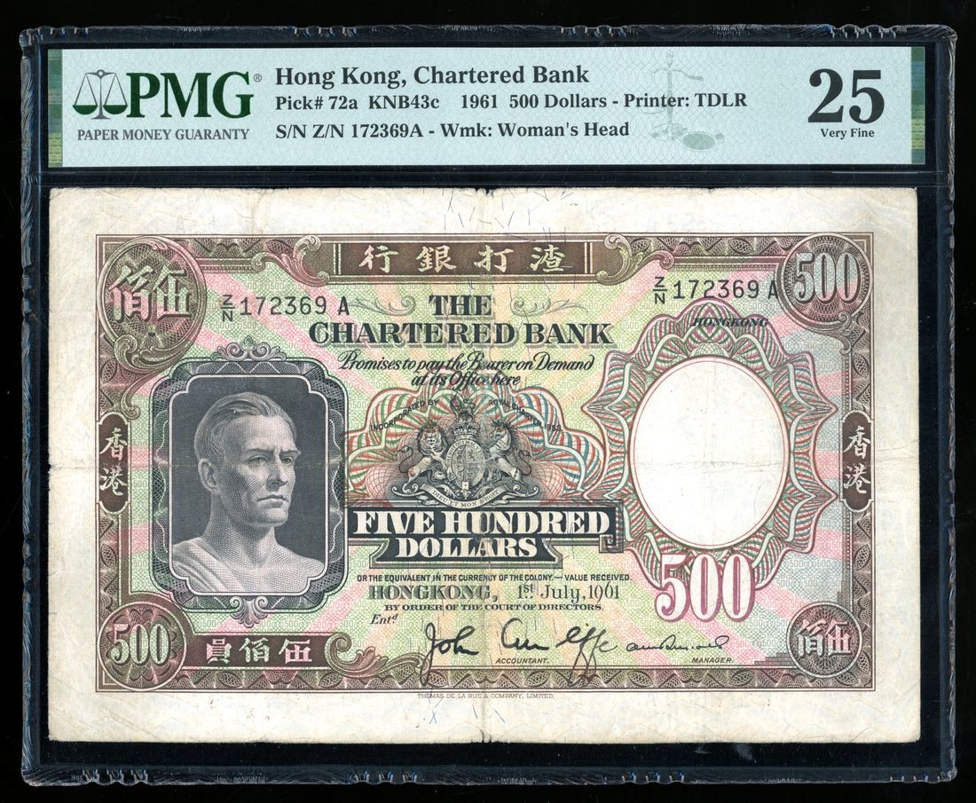 Chartered Bank, Hong Kong, $500, 1.7.1961, serial number Z/N 172369A, one handsigned signature,