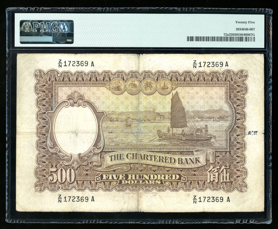 1961年渣打銀行伍佰員,編號Z/N 172369A,左下手簽署名,PMG 25,無任何評級備註非常少見