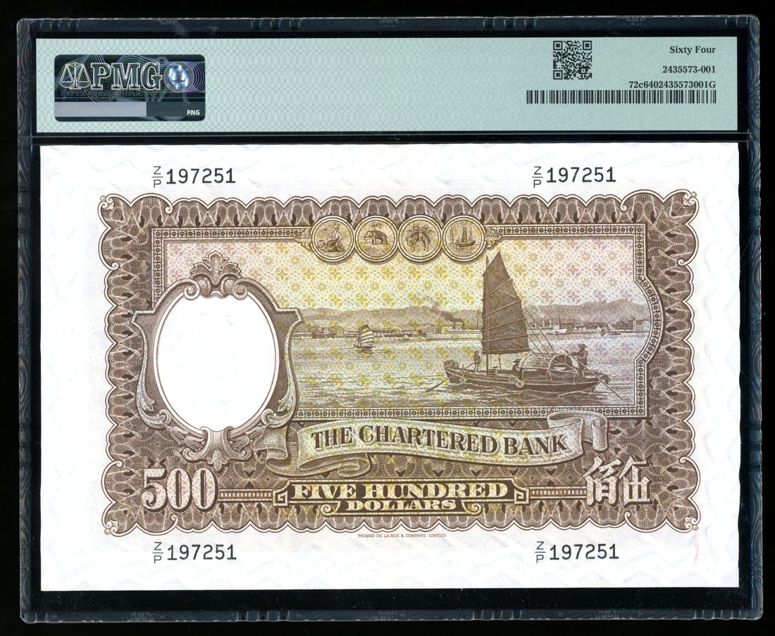 1975年渣打銀行伍佰員,編號Z/P 197251,PMG 64,1975年版較1977年版少。 據PMG統計顯示,獲評更高分的例子存世量少於20枚
