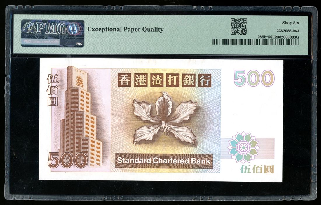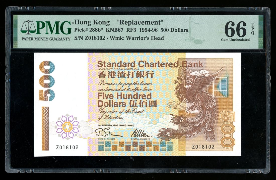 Standard Chartered Bank, Hong Kong, replacement $500, 1.1.1995, serial number Z018102, (Pick 288b*), PMG 66EPQ. Key replacement date of this later SCB series. PMG census 3rd highest grade