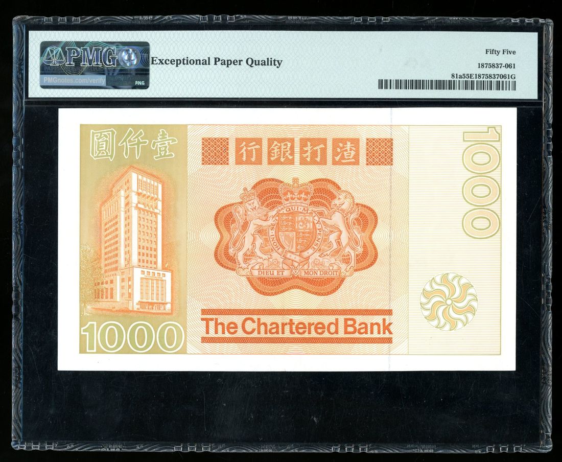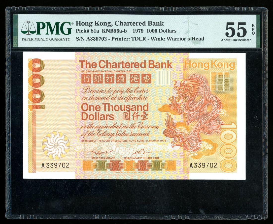 1979年渣打銀行壹仟圓,編號A339702,PMG 55EPQ。設計極具標誌性的「大金龍」一向受市場歡迎,此品保存完好,僅有一處中心摺痕,相當少見