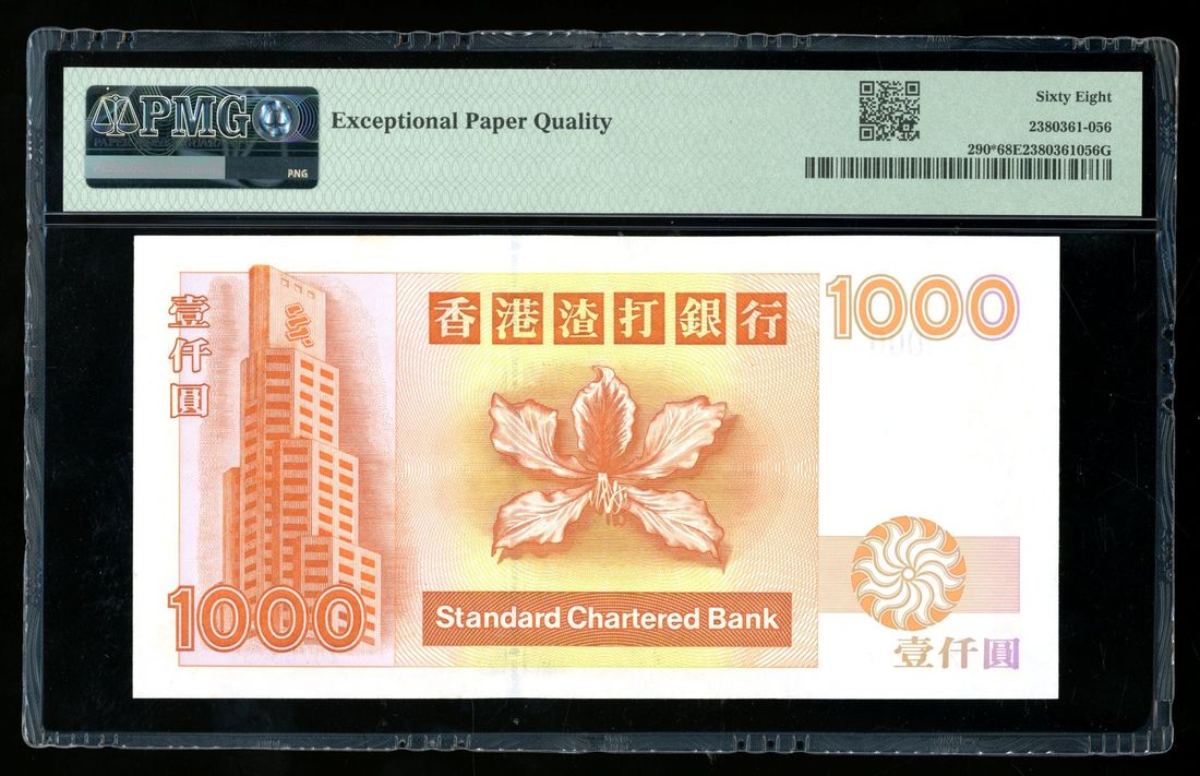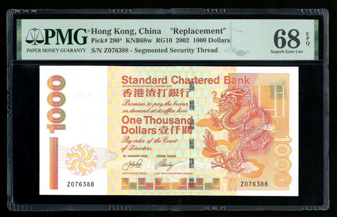 Standard Chartered Bank, Hong Kong, replacement $1000, 1.1.2002, serial number Z076388, (Pick 290*), PMG 68EPQ. Last date replacement. PMG census TOP POP, one of only two!