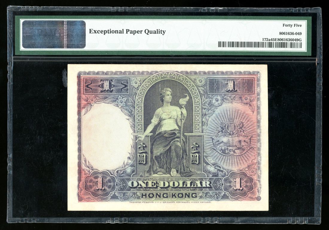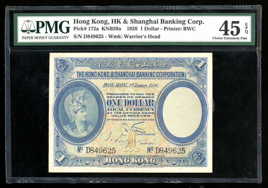 HongKong & Shanghai Banking Corporation, $1, 1.1.1926, serial number D849625, (Pick 172a), PMG 45EPQ. The earlier type