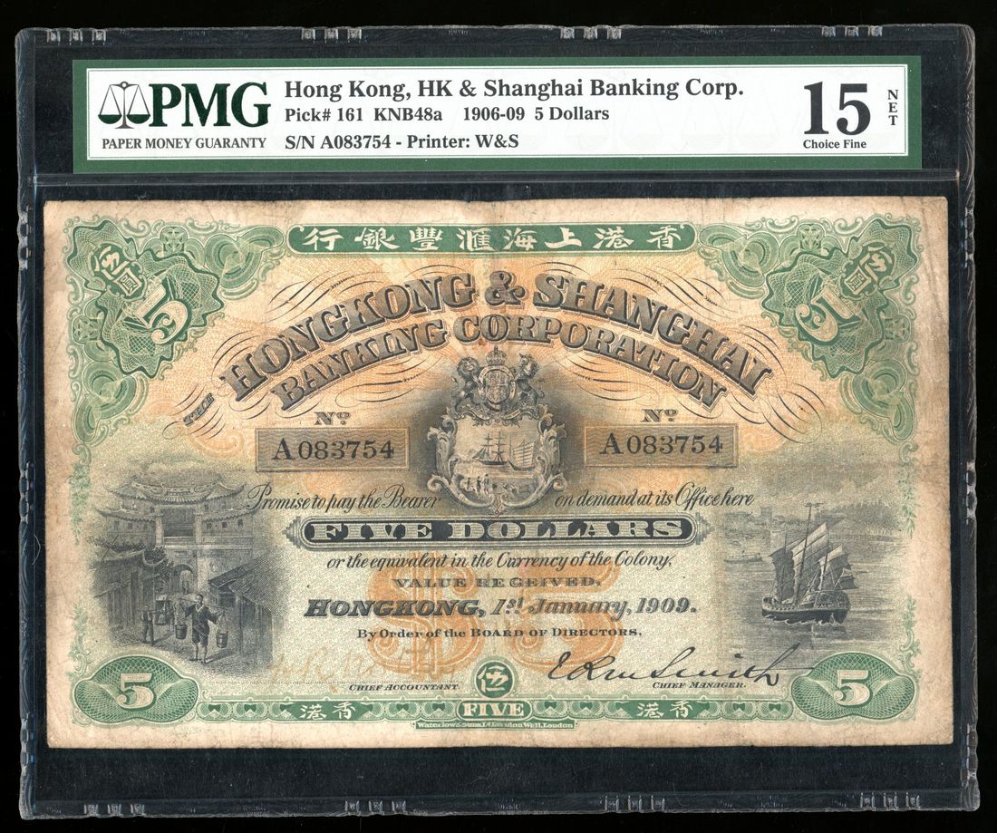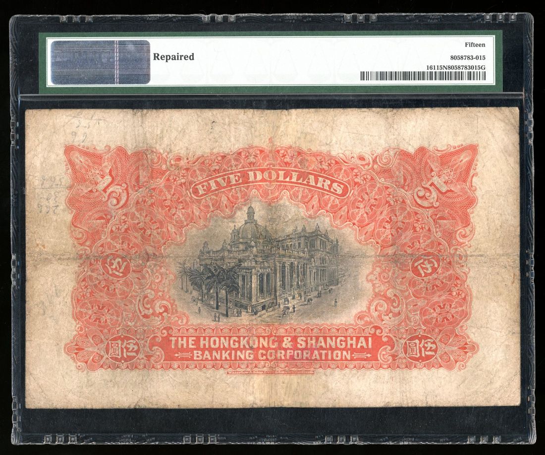 1909年香港上海匯豐銀行伍圓,編號A083754,左下手簽署名,背面紅色,PMG 15NET,有修補。罕見的首年發行版