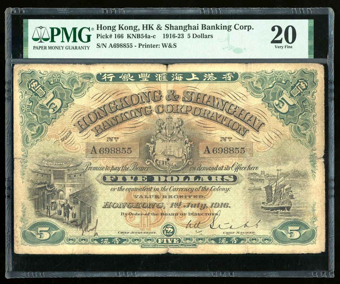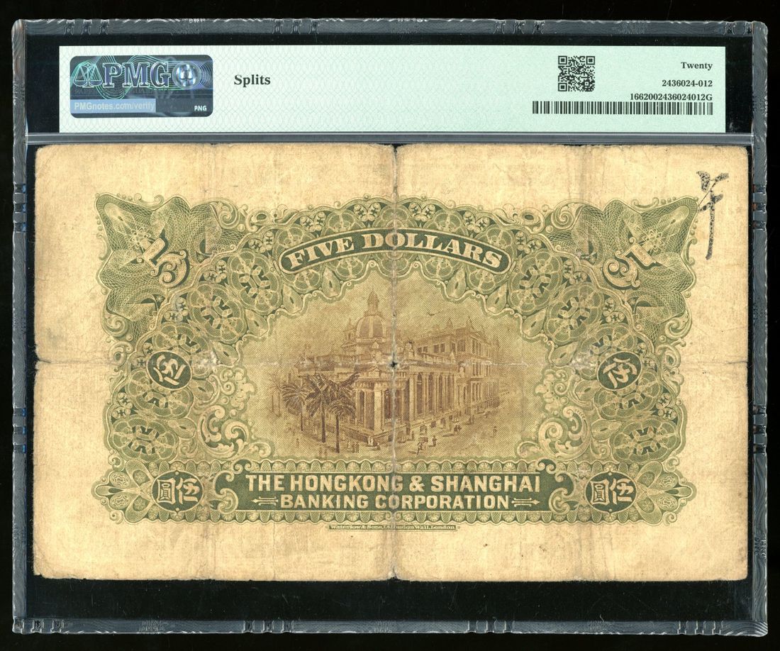 1916年香港上海匯豐銀行伍圓,編號A698855,左下手簽署名,背面綠色,PMG 20,有裂痕。「綠背」版的首發年份,鮮見原裝品
