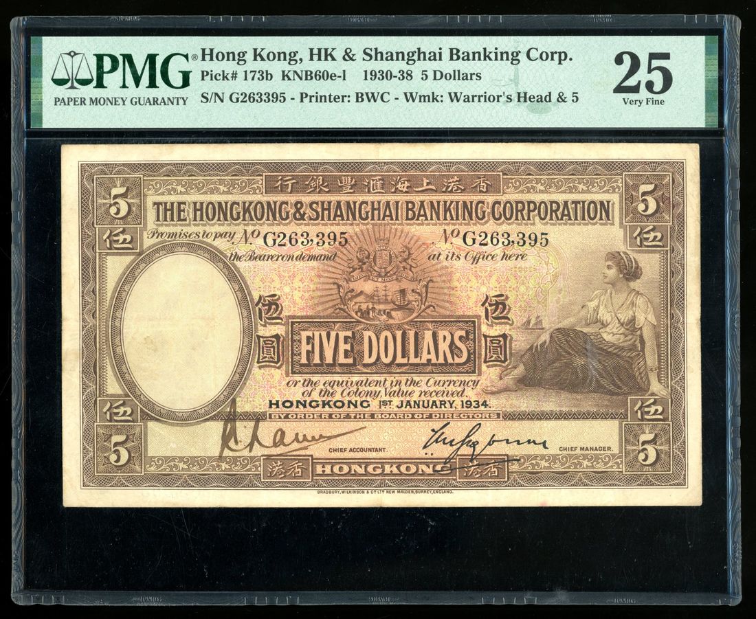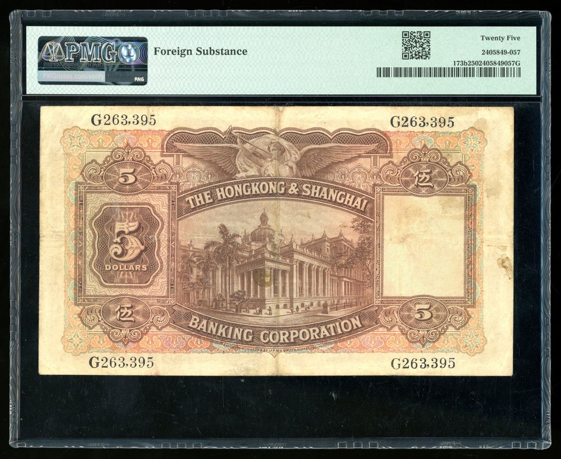 1934年香港上海匯豐銀行伍圓,編號G263395,左下手簽署名,PMG 25,有外附物