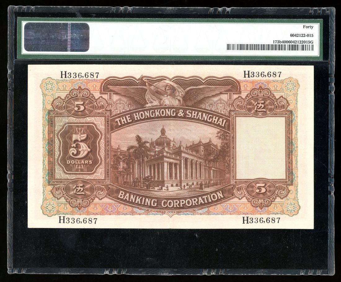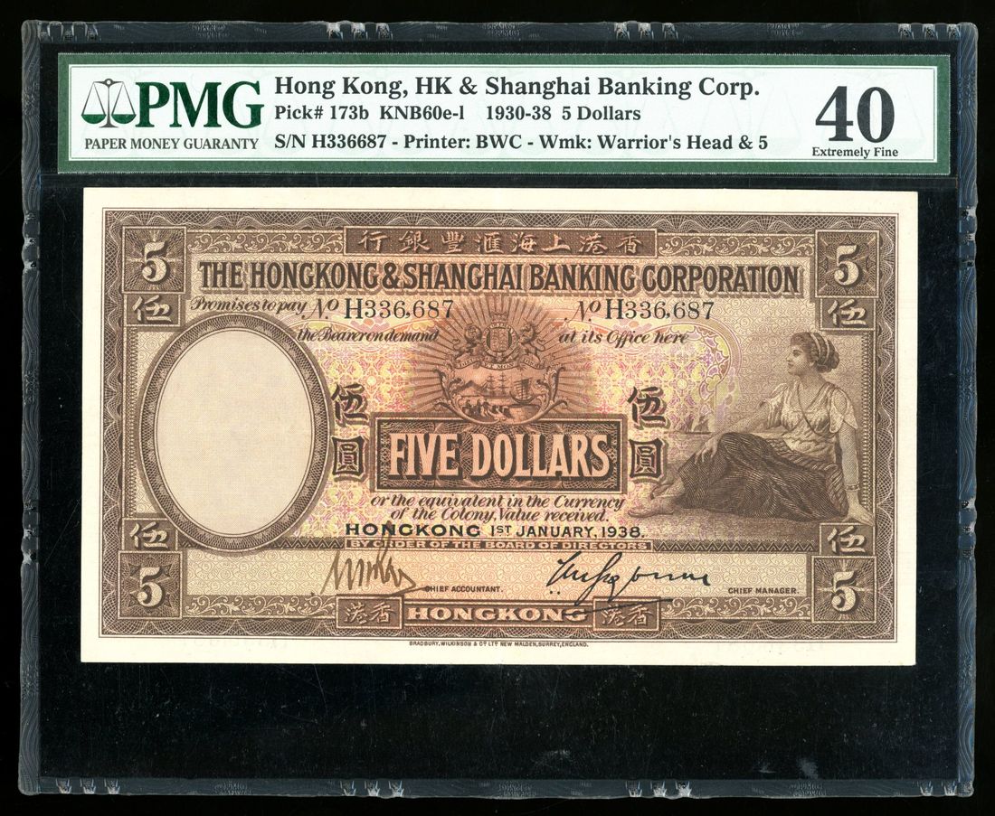 1938年香港上海匯豐銀行伍圓,編號H336687,左下手簽署名,PMG 40。該系列手簽票之尾發日期,高分罕品