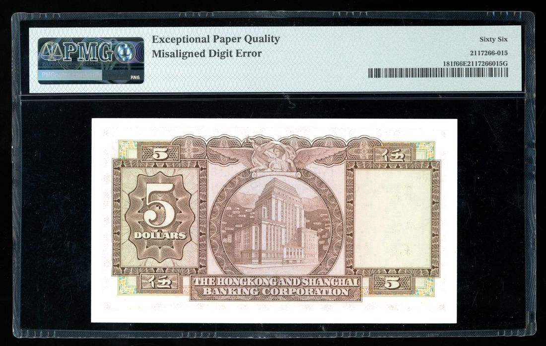 1973年香港上海匯豐銀行伍圓錯體票,編號 891136EV,跌字錯體,PMG 66EPQ