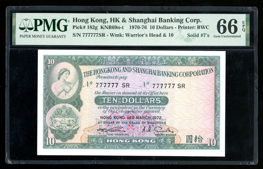 HongKong & Shanghai Banking Corporation, $10, 13.3.1972, solid serial number 777777 SR, (Pick 182g), PMG 66EPQ