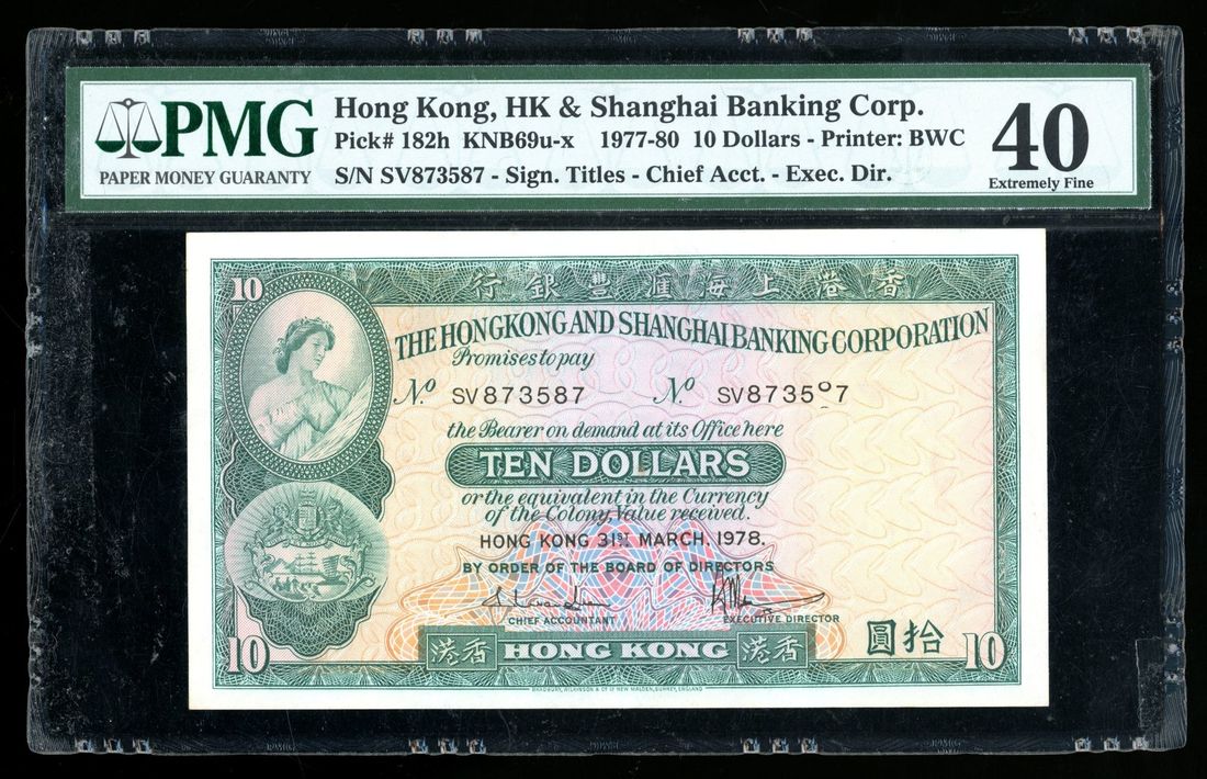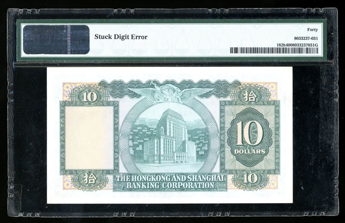 1978年香港上海匯豐銀行拾圓錯體票,編號 SV8735387,跌字錯體,PMG 40