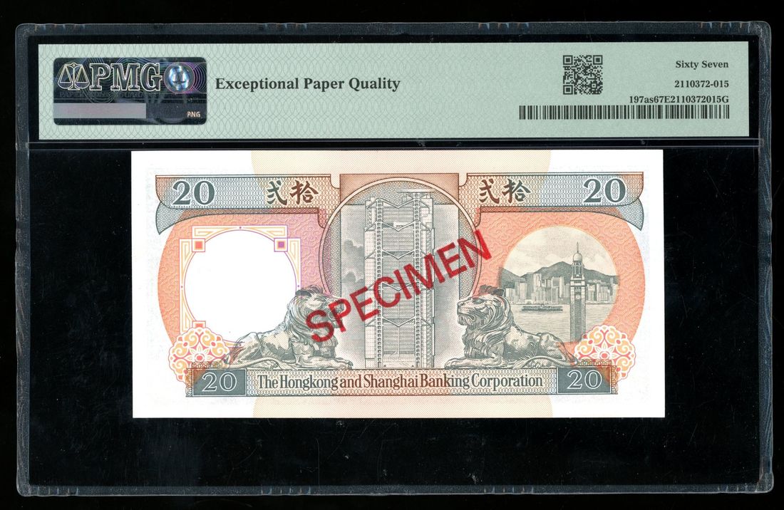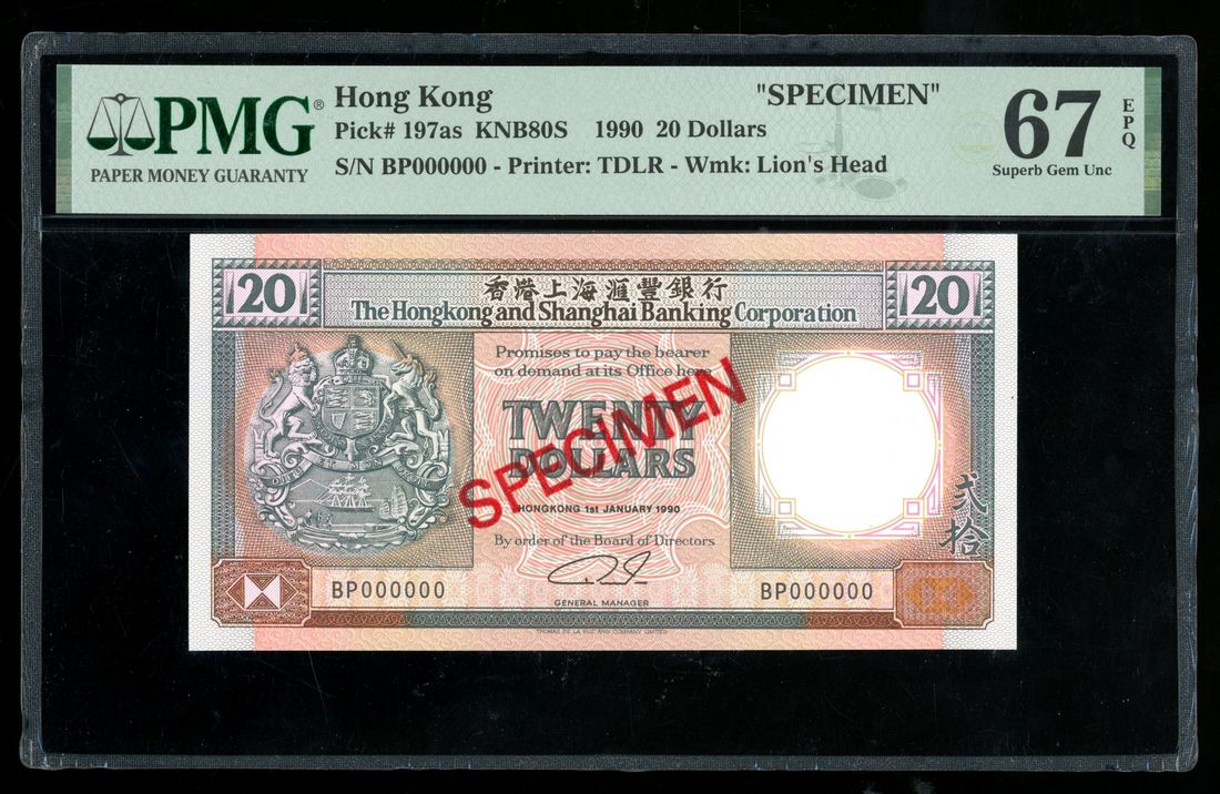 HongKong & Shanghai Banking Corporation, specimen $20, 1.1.1990, serial number BP000000, (Pick 197as), PMG 67EPQ. Specimen for this later $20 rarely appear on the market compared to its earlier counterpart. PMG census one of only five total graded and TOP POP! Rare