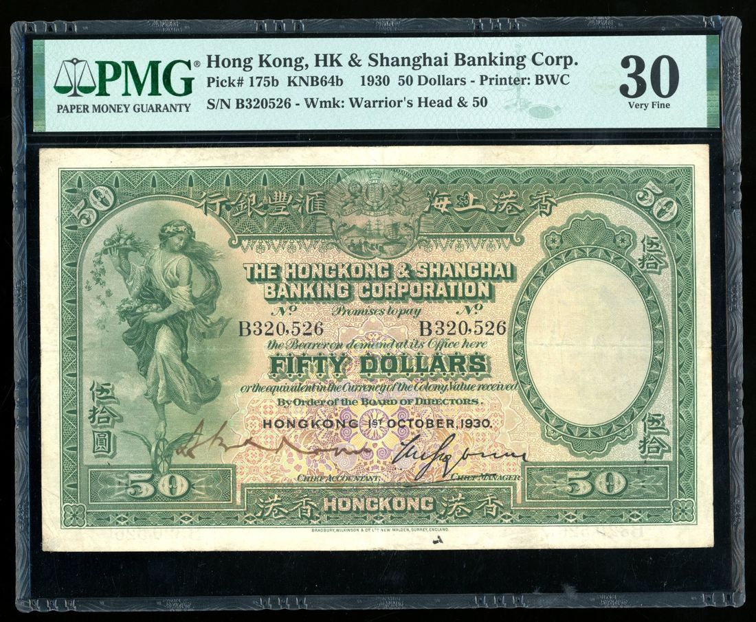 1930年香港上海匯豐銀行伍拾圓,編號B320526,左下手簽署名,PMG 30,有筆註。本枚並非迫簽版,市場上極少出現,值得珍視