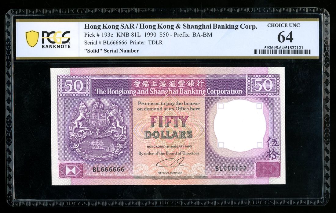 HongKong & Shanghai Banking Corporation, $50, 1.1.1990, solid serial number BL666666, (Pick 193c), PCGS 64. Solid numbers on this earlier $50 note quite rare